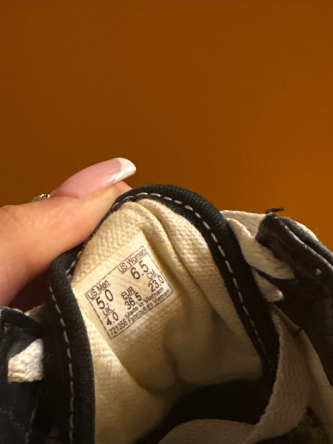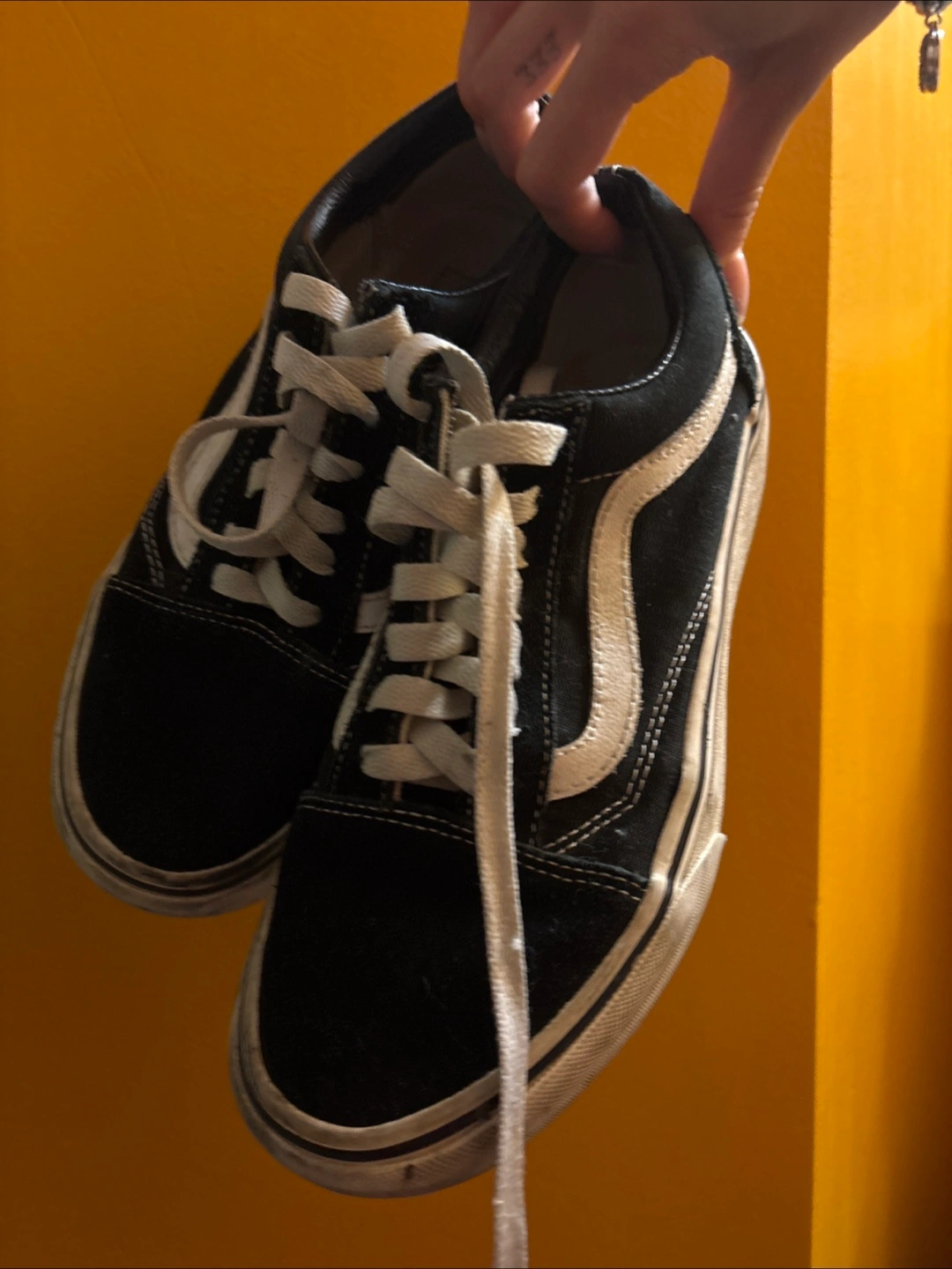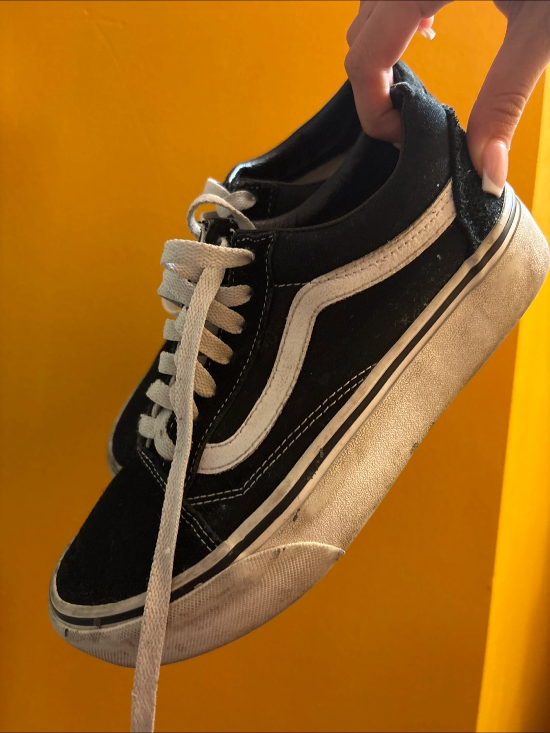 Selling a pair of Vans Old Skool platformed sneakers in black and white. They're in good condition and ready for a new home! The size is Women's 6.5 (US).