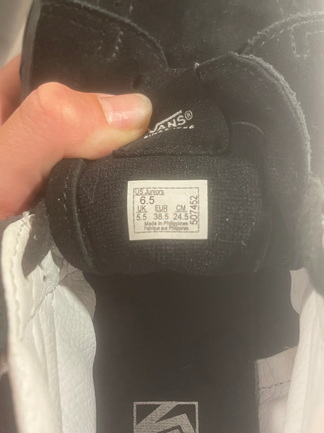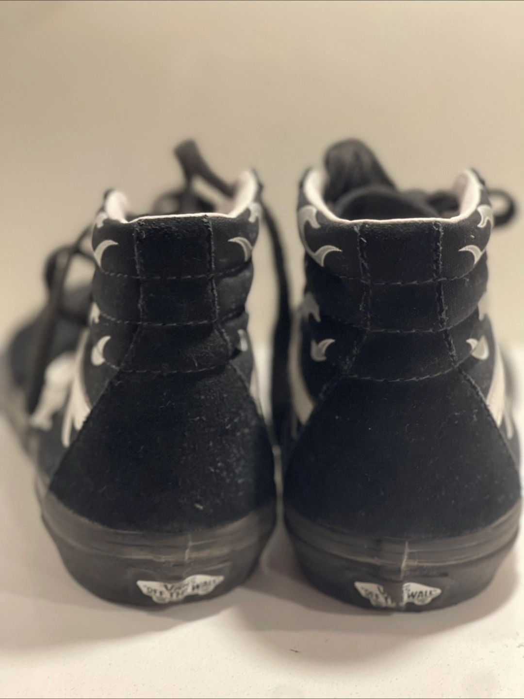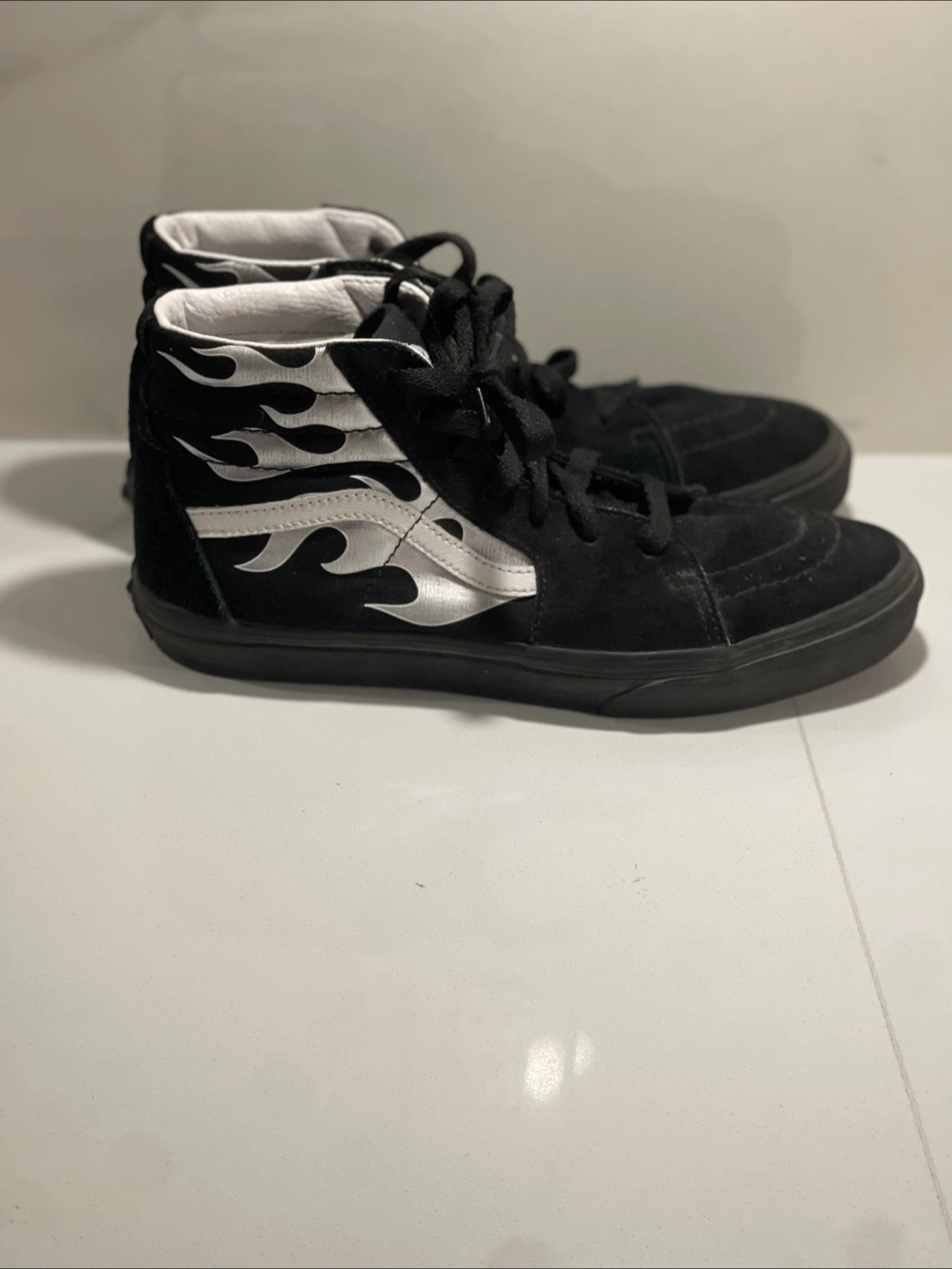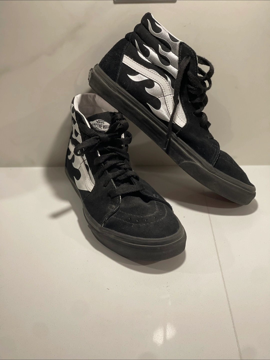 Selling a pair of Vans Sk8-Hi Flame sneakers in black and white! These are a US Juniors size 6.5. They are barely worn and are grate condition for everyday wear. The flame design adds a cool touch!