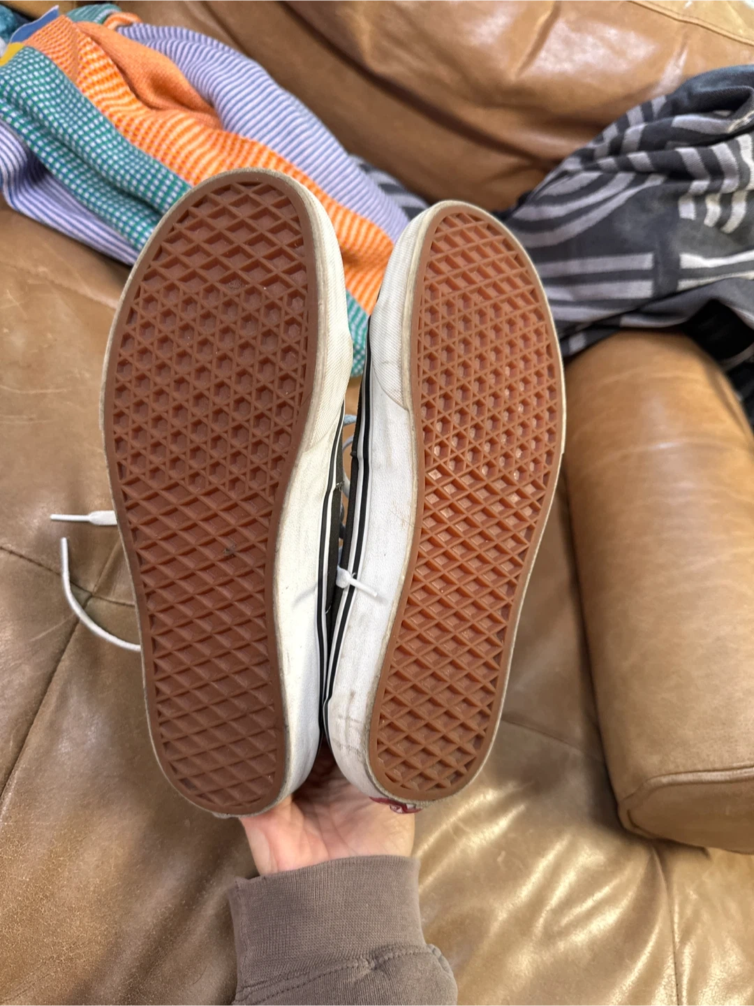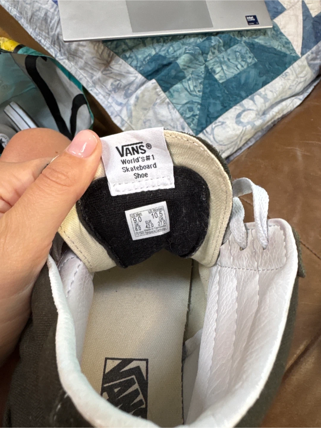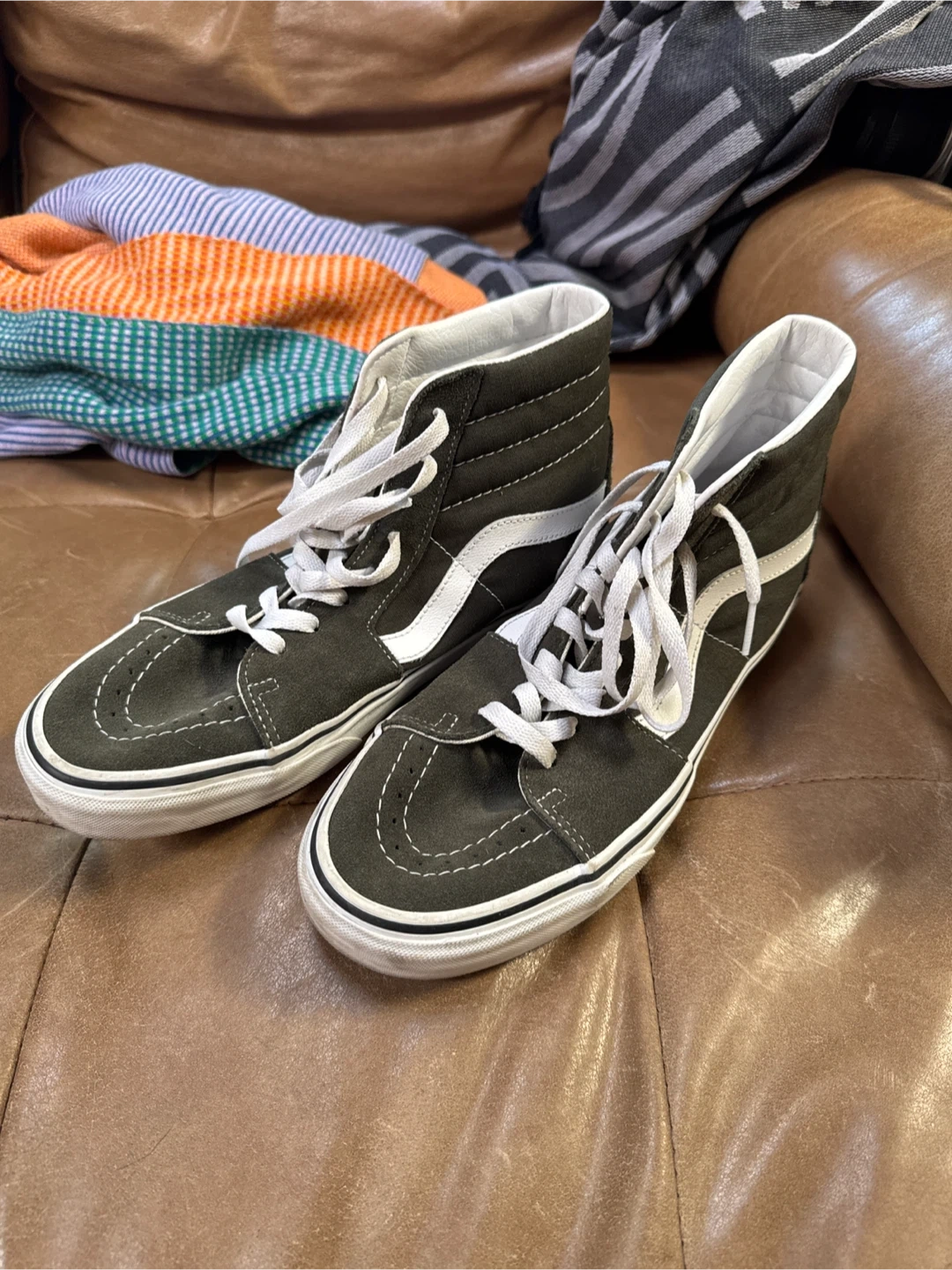 Selling a pair of Vans SK8-Hi sneakers in a stylish olive green colour! These are in great condition and ready for a new home. They're a US women's size 10.5.
