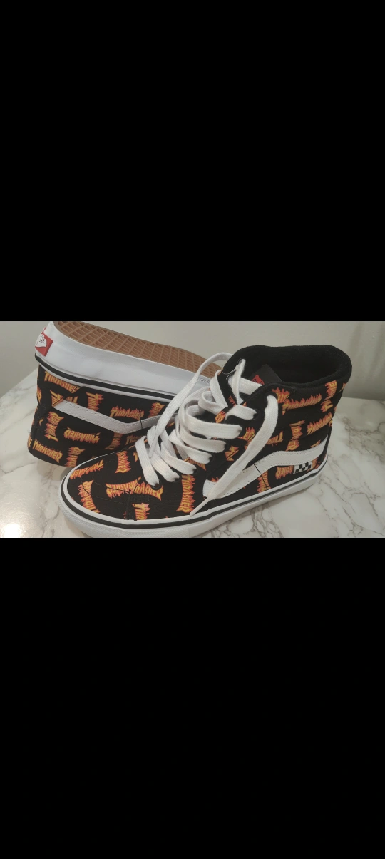 Step up your skate style with these new Vans x Thrasher high-top shoes, featuring a fiery flame logo design. These kicks are as cool as they are comfortable, perfect for hitting the streets or just kicking back. * Brand: Vans * Collaboration: Thrasher * Style: High-Top Skate Shoes * Condition: New * Features: Iconic flame logo, durable construction Looking to add some heat to your shoe collection? These Vans are hotter than a summer bonfire! Don't miss out—if the ad's up, they're ready to roll!