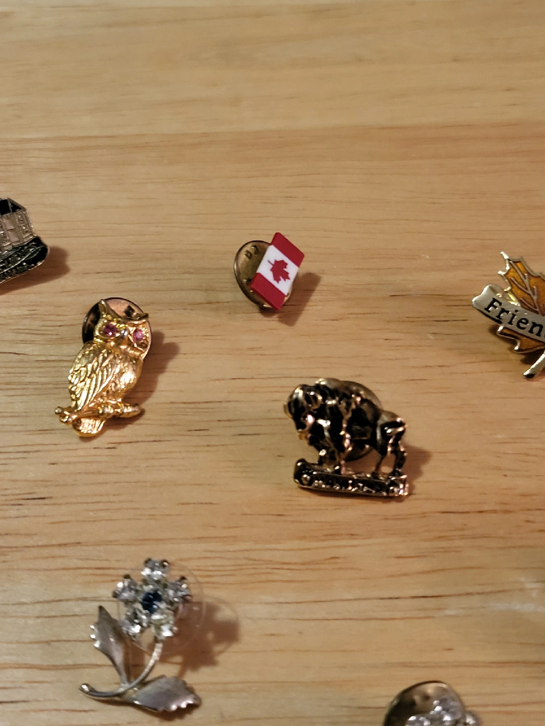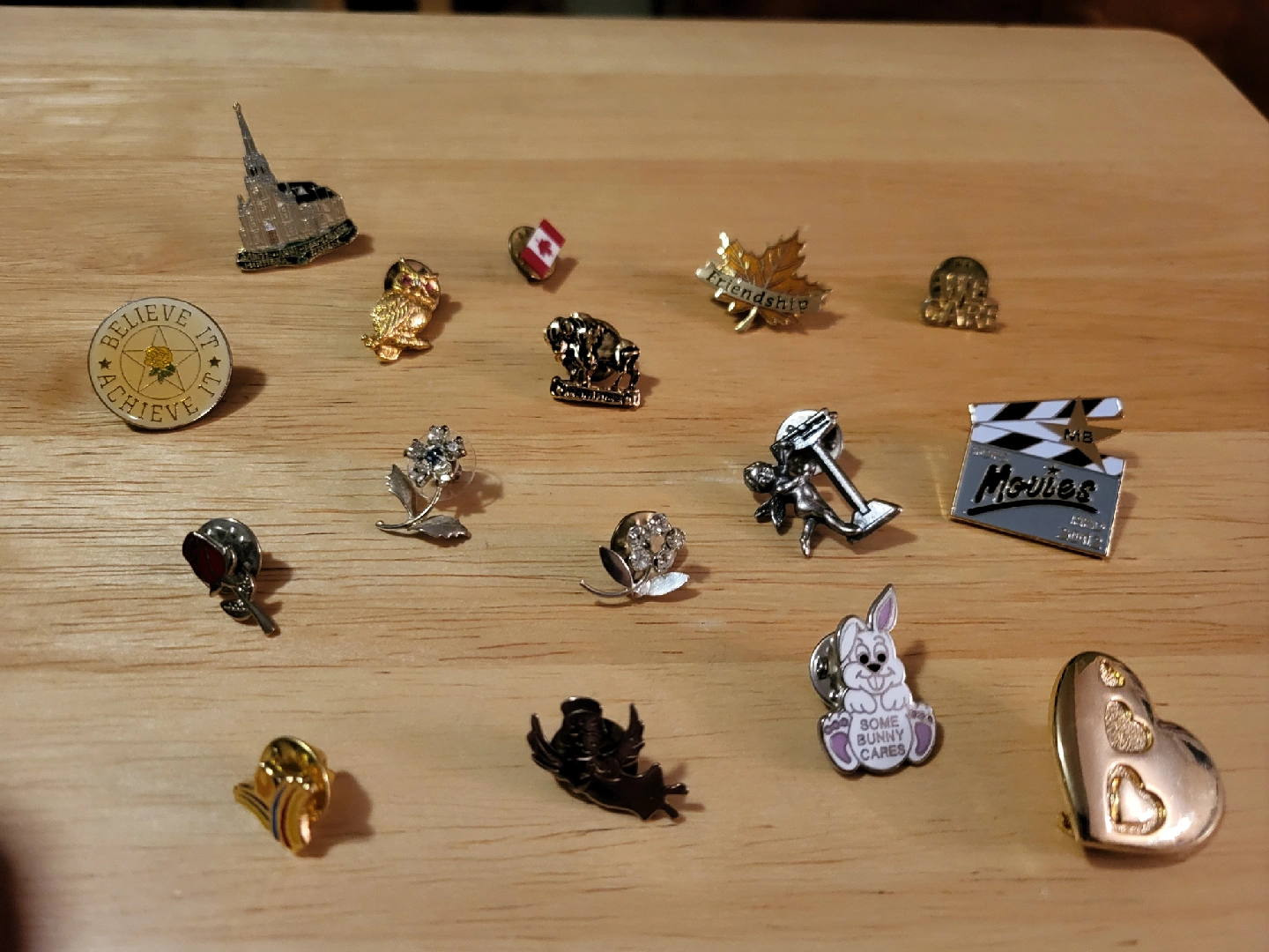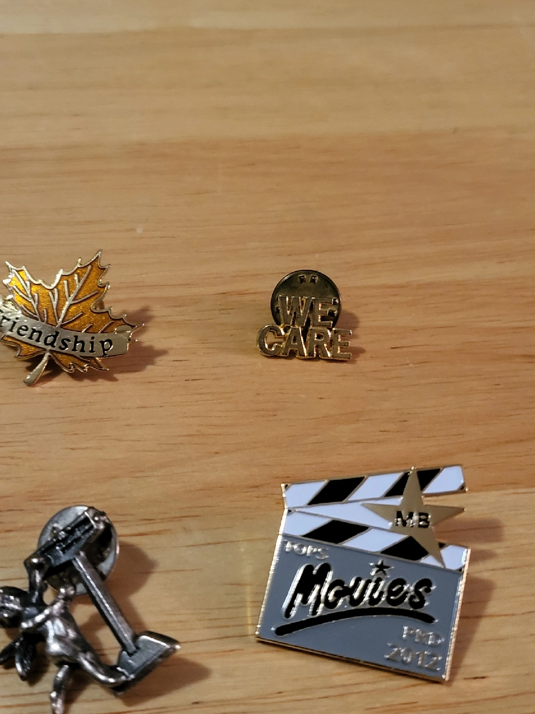 Selling a variety of collectible pins! There's a maple leaf 'friendship' pin, a 'We Care' pin, a movie clapperboard pin, and several other unique designs. Perfect for collectors or anyone looking to add some flair to their jacket or bag