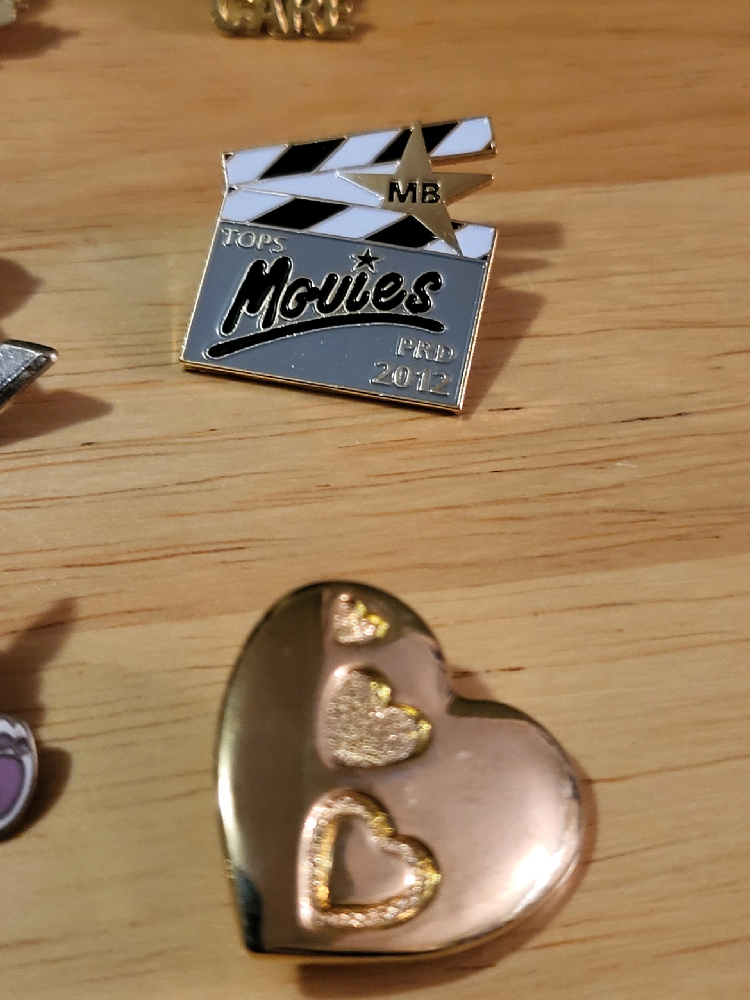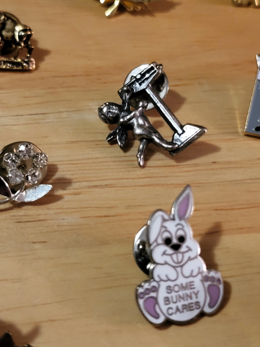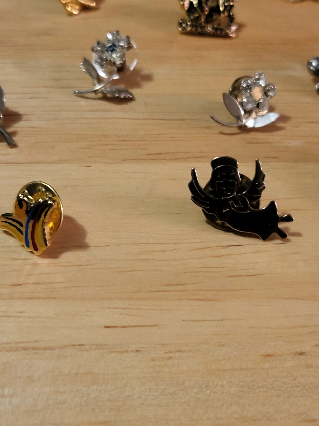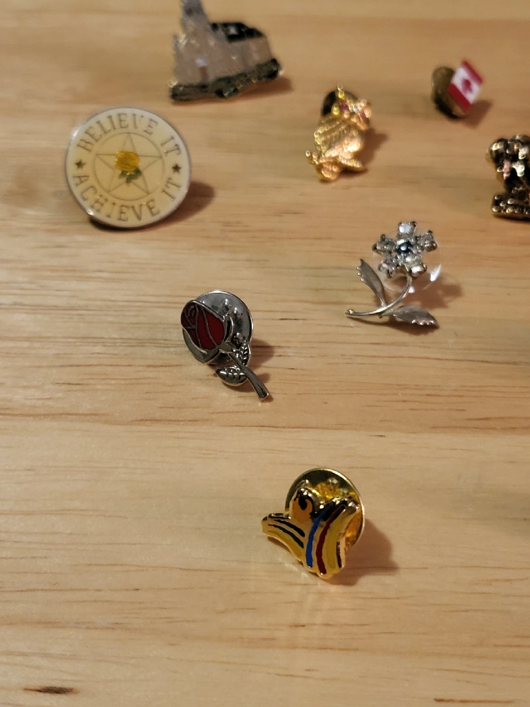 Selling a variety of collectible pins! There's a maple leaf 'friendship' pin, a 'We Care' pin, a movie clapperboard pin, and several other unique designs. Perfect for collectors or anyone looking to add some flair to their jacket or bag