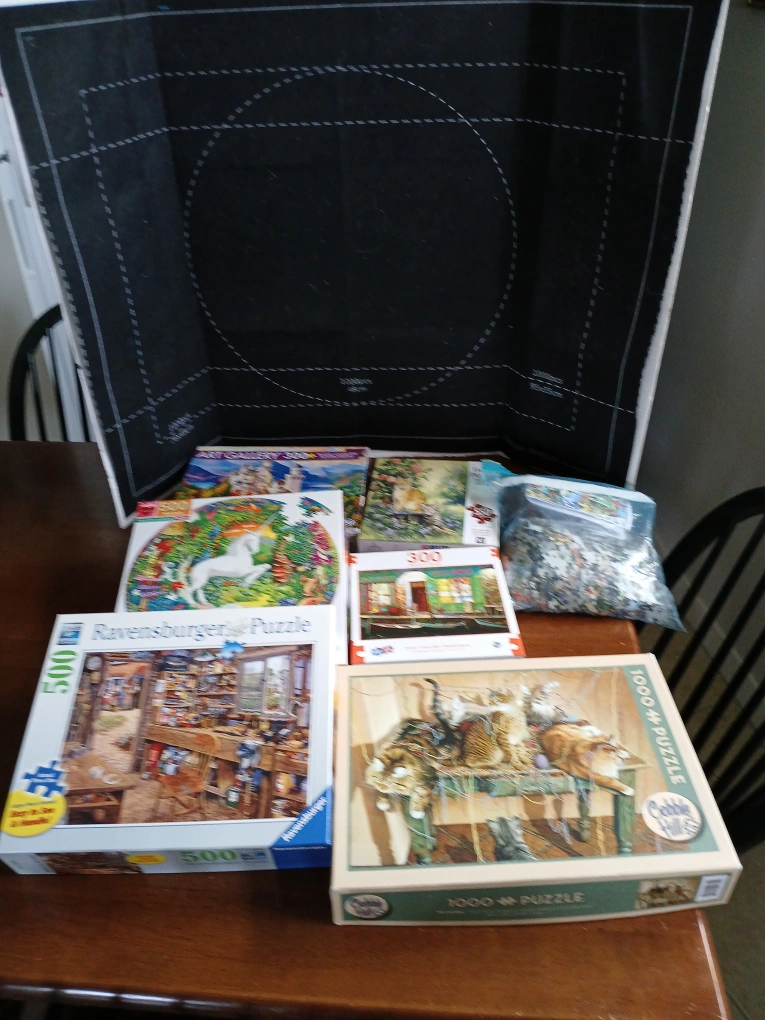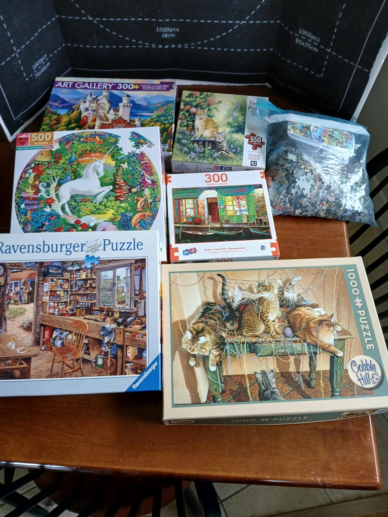 Selling a collection of jigsaw puzzles! Includes brands like Ravensburger .. Great for puzzle enthusiasts!. Also includes puzzle mat.
