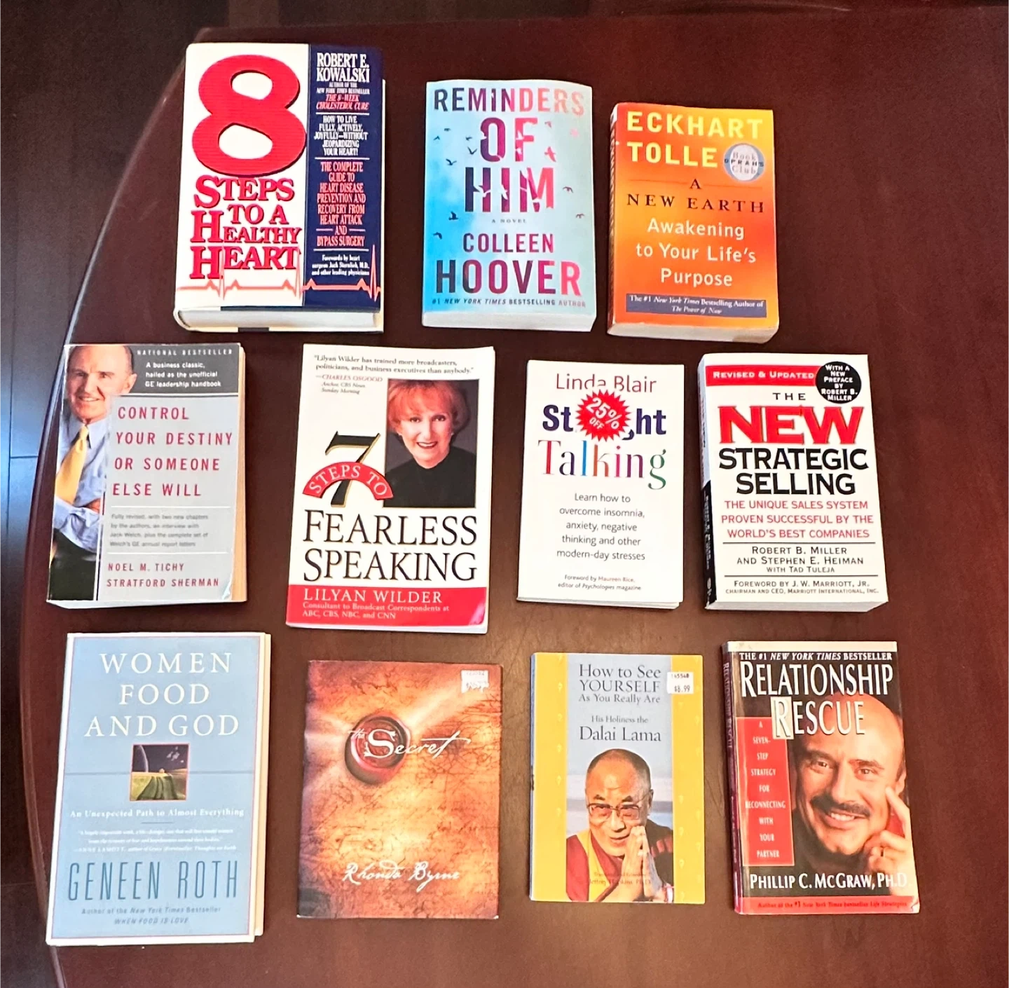 HUGE DEAL! Choose any 6 books for $20.00. Titles include: - 8 Steps to a Healthy Heart by Robert E Kowalski - Reminders of Him by Colleen Hoover - A New Earth by Eckhart Tolle - Control Your Destiny or Someone Else Will by Noel M. Tichy and Stratford Sherman - 7 Steps to Fearless Speaking by Lilyan Wilder - Straight Talking by Linda Blair - The New Strategic Selling by Robert B Miller and Stephen E. Heiman - Women Food and God by Geneen Roth - The Secret by Rhonda Byrne - How to See Yourself As You Really Are by Dalai Lama (priced at $8.99) - Relationship Rescue by Phillip C. McGraw Perfect for anyone interested in self-help, relationships, and personal growth