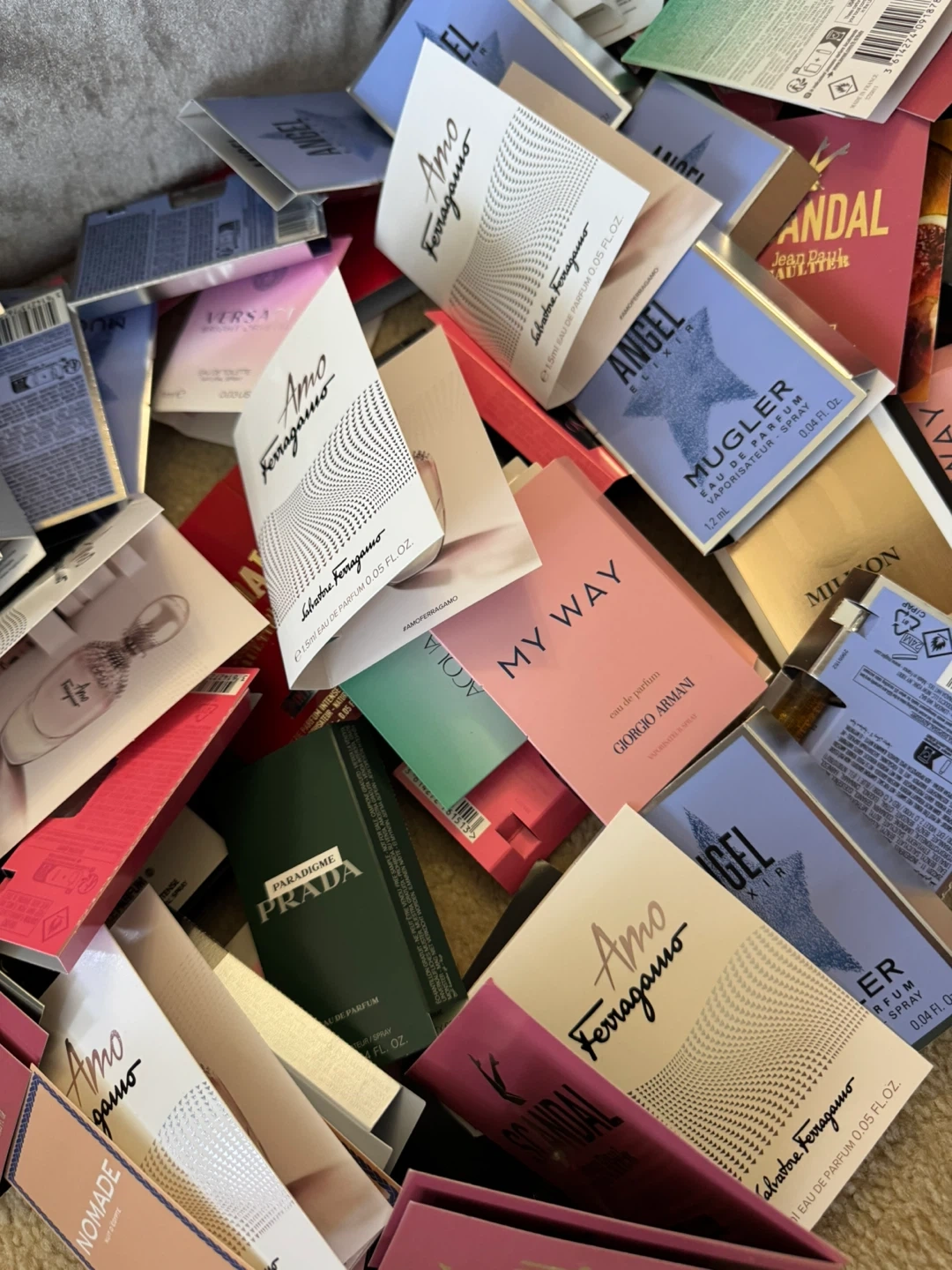 I have a collection of perfume sample vials from various brands, including Salvatore Ferragamo (Amo), Prada (Paradigm), Mugler (Angel Elixir), Giorgio Armani (My Way), and Jean Paul Gaultier (Scandal). Perfect for trying out new scents! $70/50 pieces. Or 7 together for $10 . Randomly