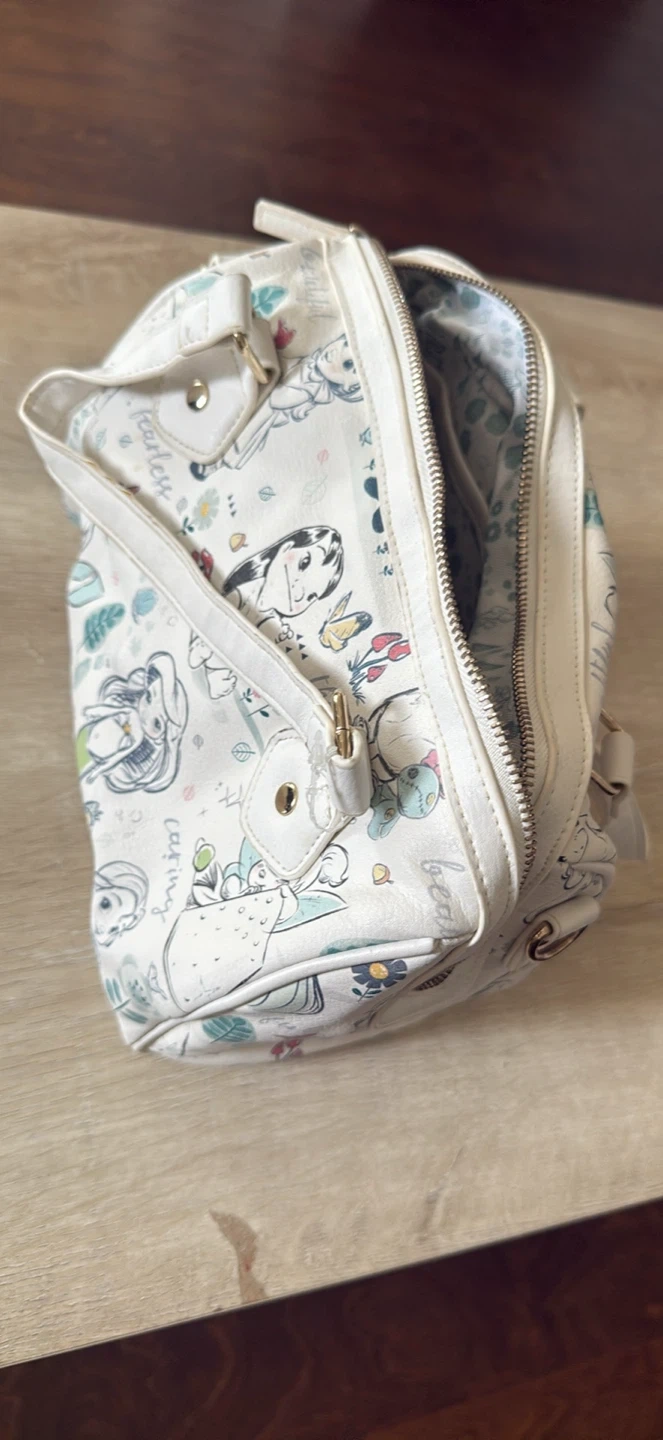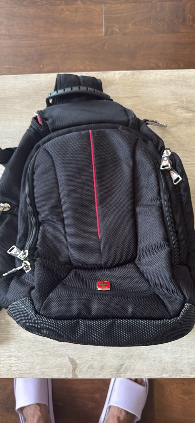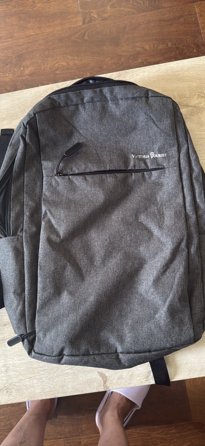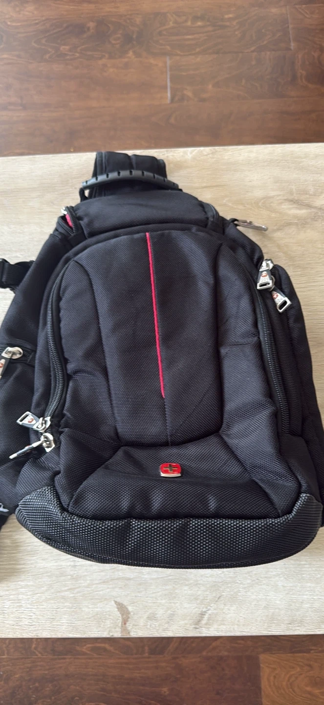 Selling a variety of used backpacks. There is a Victoria Tourist backpack, a black backpack with a red stripe, a white Disney-themed bag, a small black and red backpack, and a Nubily black backpack. All are in good condition and ready for a new home!
