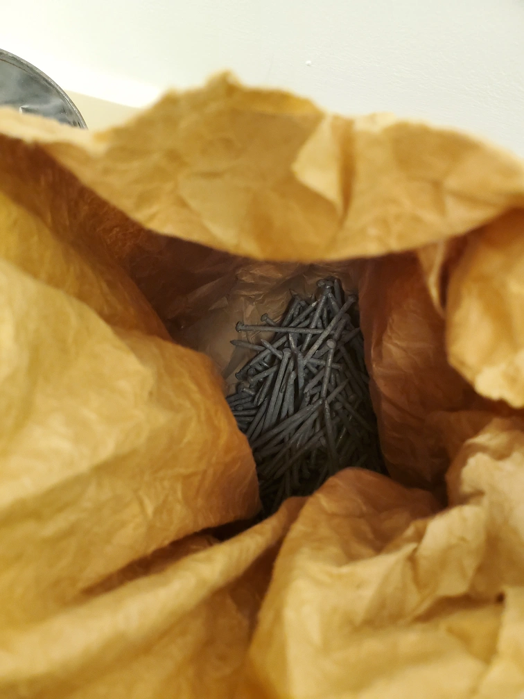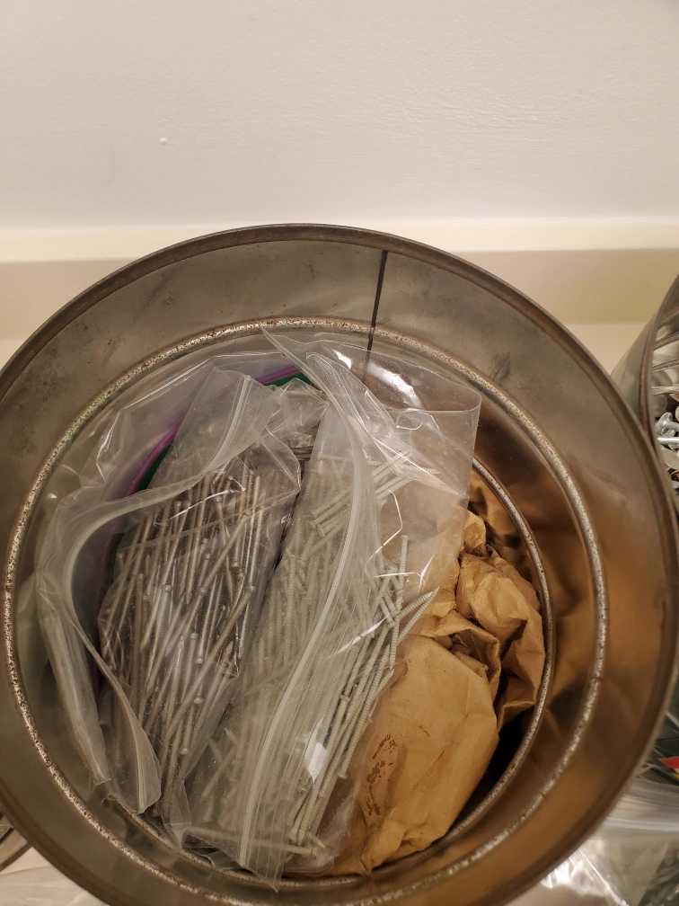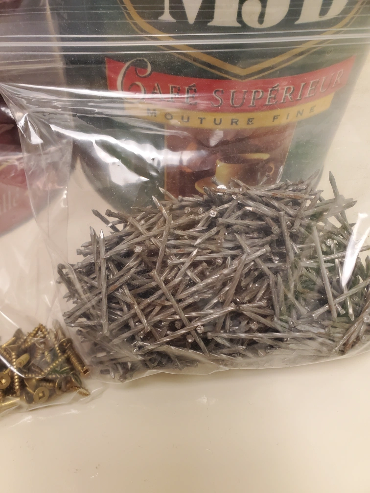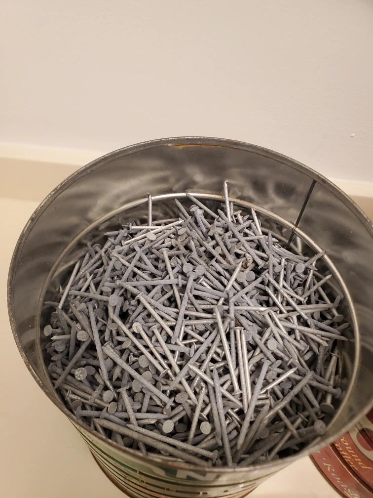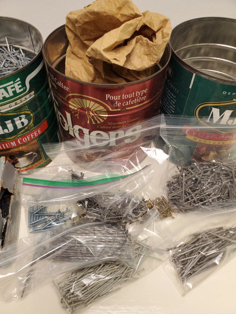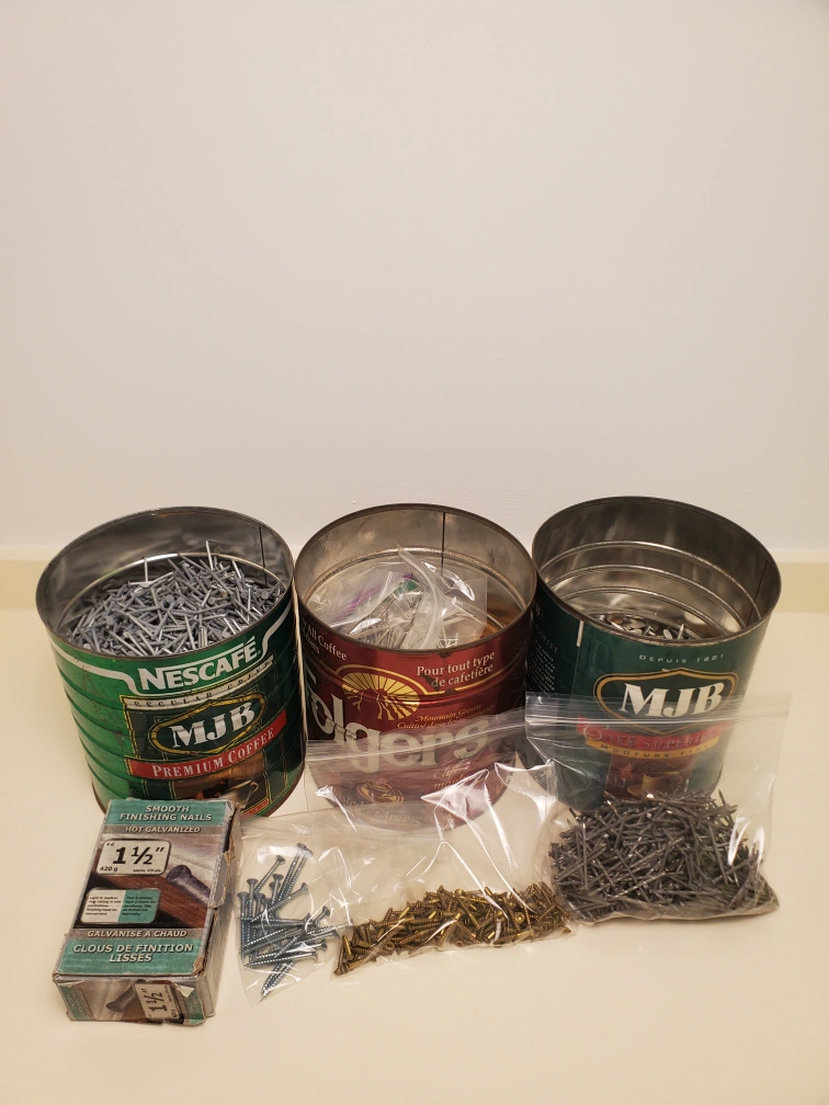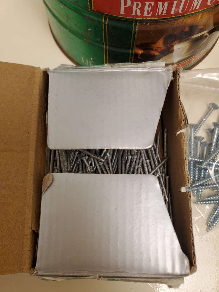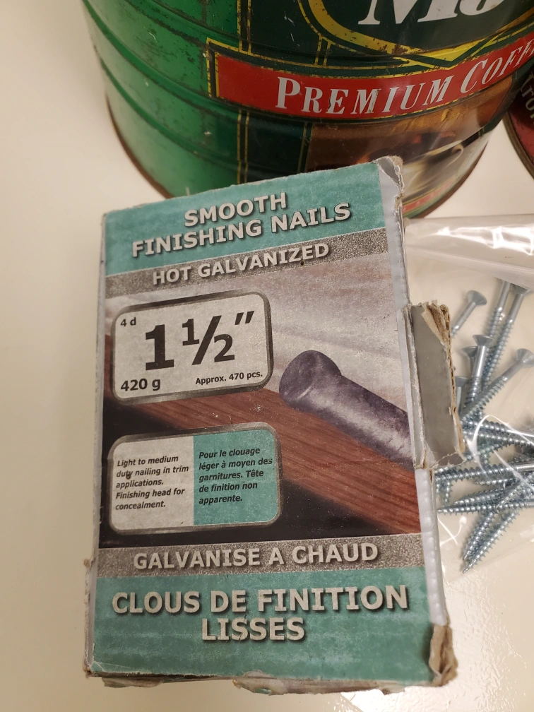 I have a variety of nails and screws available. They are stored in repurposed coffee tins for easy organization. There are also some 1 1/2" finishing nails in a box.