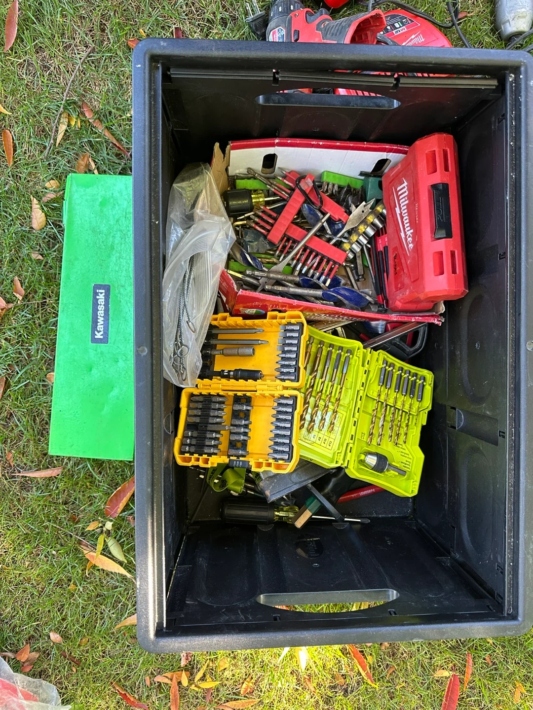 Random tools including screwdrivers, drill bits, and other accessories from brands like Milwaukee, DeWalt and Ryobi. Must take all! Bin not included.