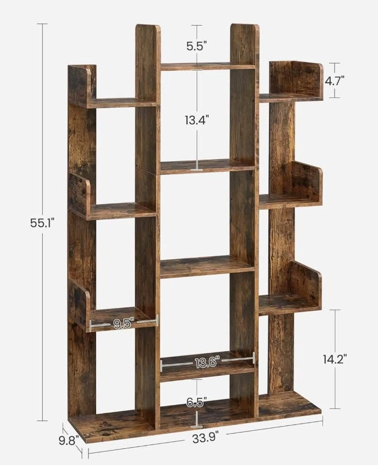 📍 Pick up: Brock Road and Rex Heath Drive in Pickering 💰 NO HOLDS ⚠️⚠️Please see cracks in pictures NOT VIDEO. The video on this listing is for an old shelf that sold. The cracks on this listing is circled in the last 4 photos. There’s only 3 cracks and it does not affect the functionality of the shelf. The last photo highlights the 3 spots where the cracks are. Upgrade your space with this unique tree-shaped bookcase! With 13 storage shelves, it’s perfect for displaying books, plants, photos, or décor. Stylish rustic brown finish blends seamlessly with modern or cozy interiors. ✅ Tree-inspired design – eye-catching & functional ✅ 13 shelves for books & display items ✅ Space-saving: 33.9”L x 9.8”W x 55.1”H ✅ Sturdy & durable build 📖 Perfect for living rooms, bedrooms, or offices. ✨ Add character to your home today! ✨