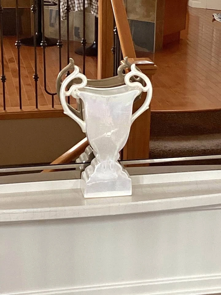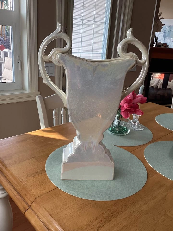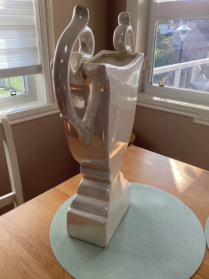 Ceramic, 19 1/2” at tallest and 13 1/4” at widest, picks up colors around it - iridescence, beautiful, cream colored, looks great with greenery, $30 obo, non smoking home