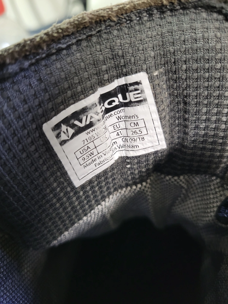 Selling a pair of Vasque women's hiking boots in size 9.5W! They're in good condition and ready for your next outdoor adventure. The label shows they are size EU 41, CM 26.5. Manufactured in Vietnam 2018 September 09