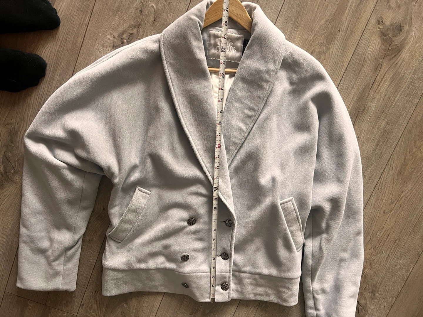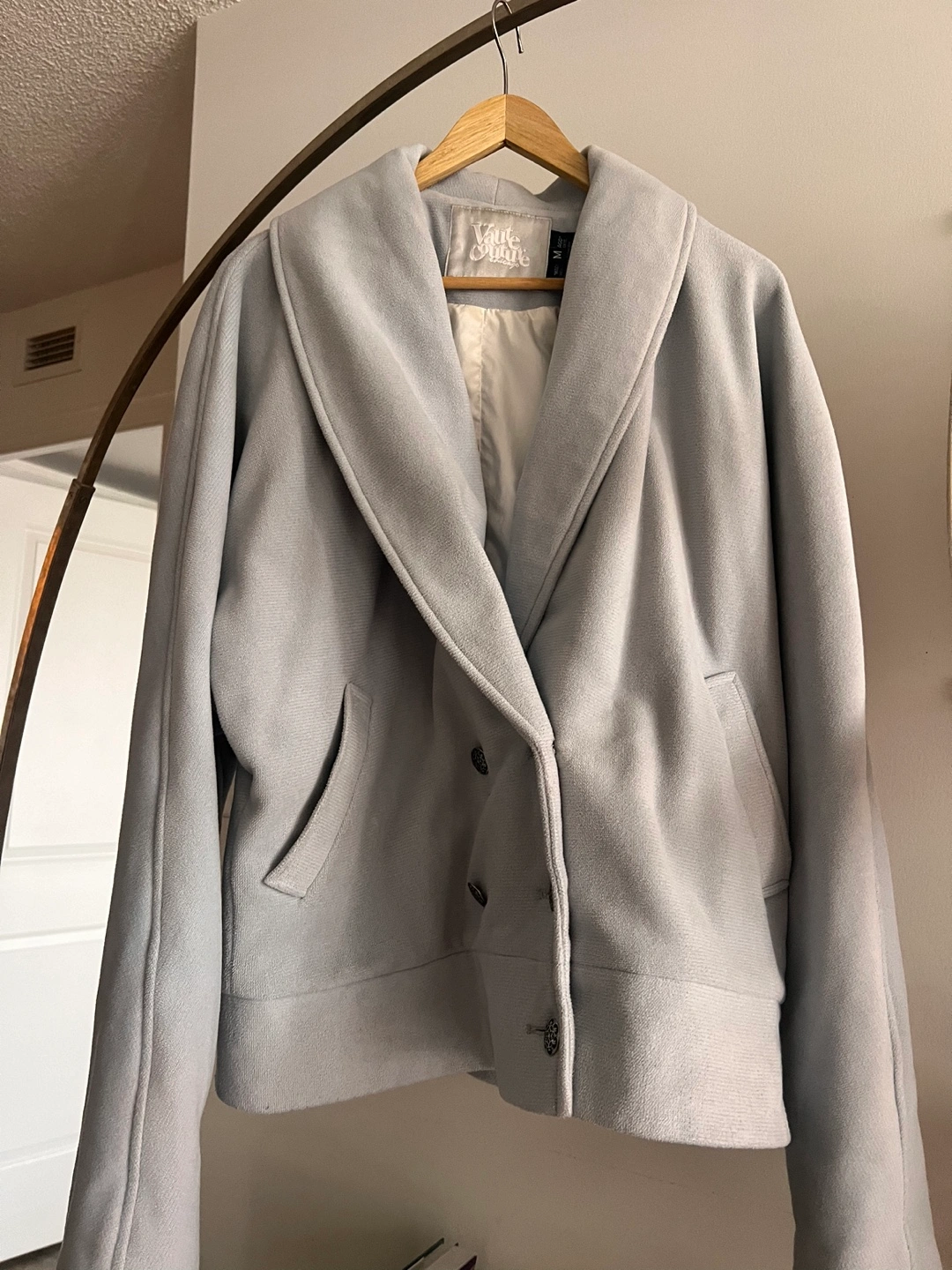 vaute couture short kimono from 2011. The well-loved vegan brand was popular amongst the vegan and vegetarian community for years but the brand was discontinued. This rare item was part of a limited run for this style. Selling because I'm thinning down my wardrobe. Recently washed, in perfect condition! Pickup in Old Town Toronto Light blue peacoat. Collared, double-breasted. Metal buttons. Boxy fit. Size small.