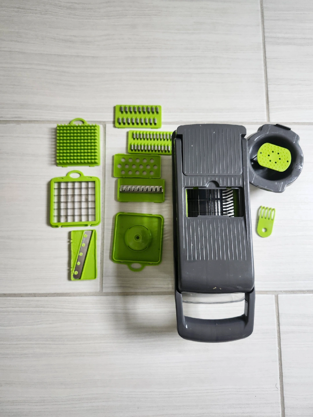 This vegetable chopper comes with a variety of interchangeable blades for different cutting styles! It's perfect for making quick work of meal prep and creating uniform slices, dices, and juliennes. Easy to use and clean, it's a great addition to any kitchen
