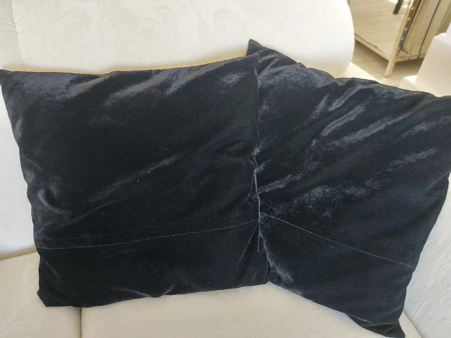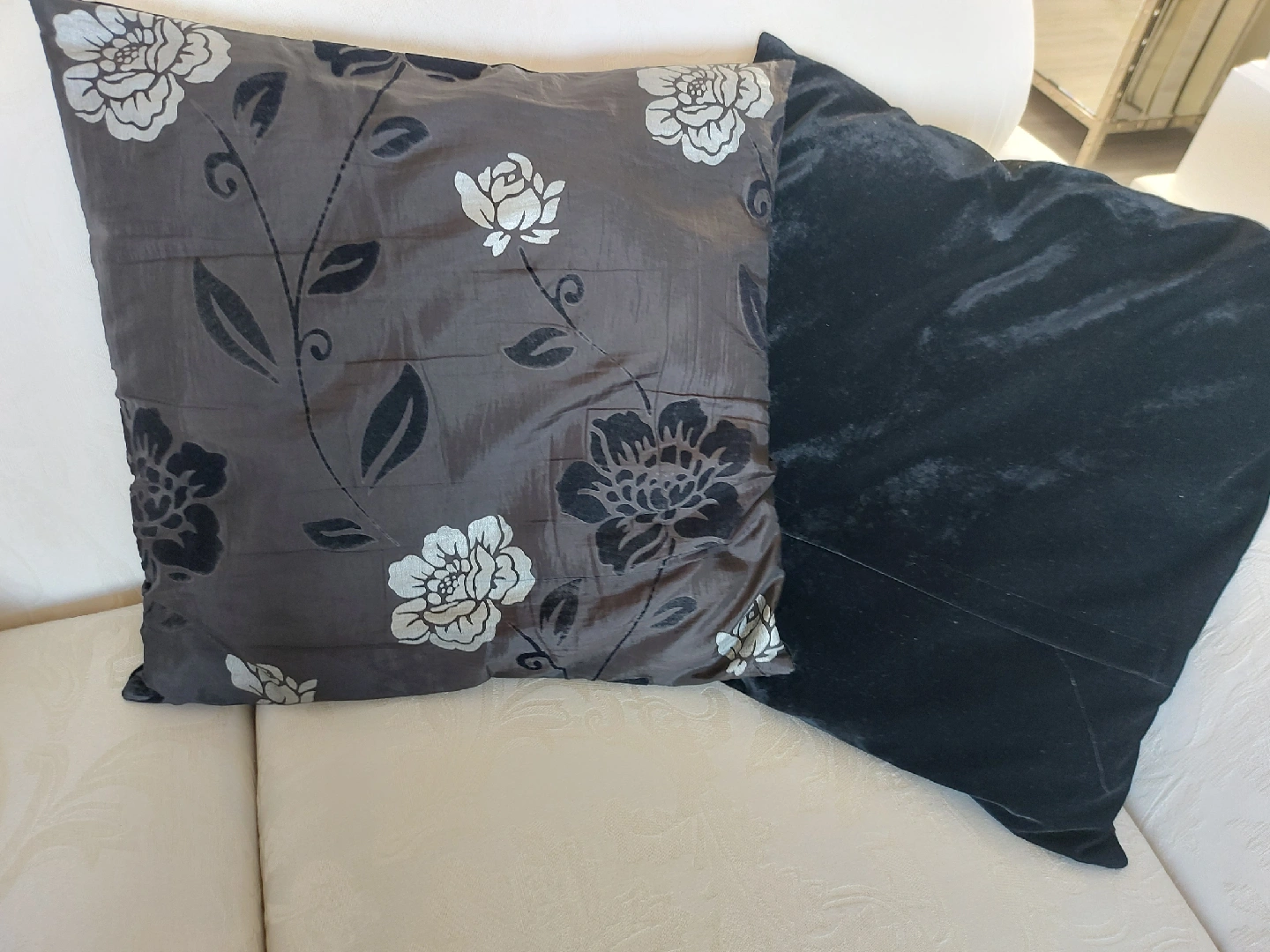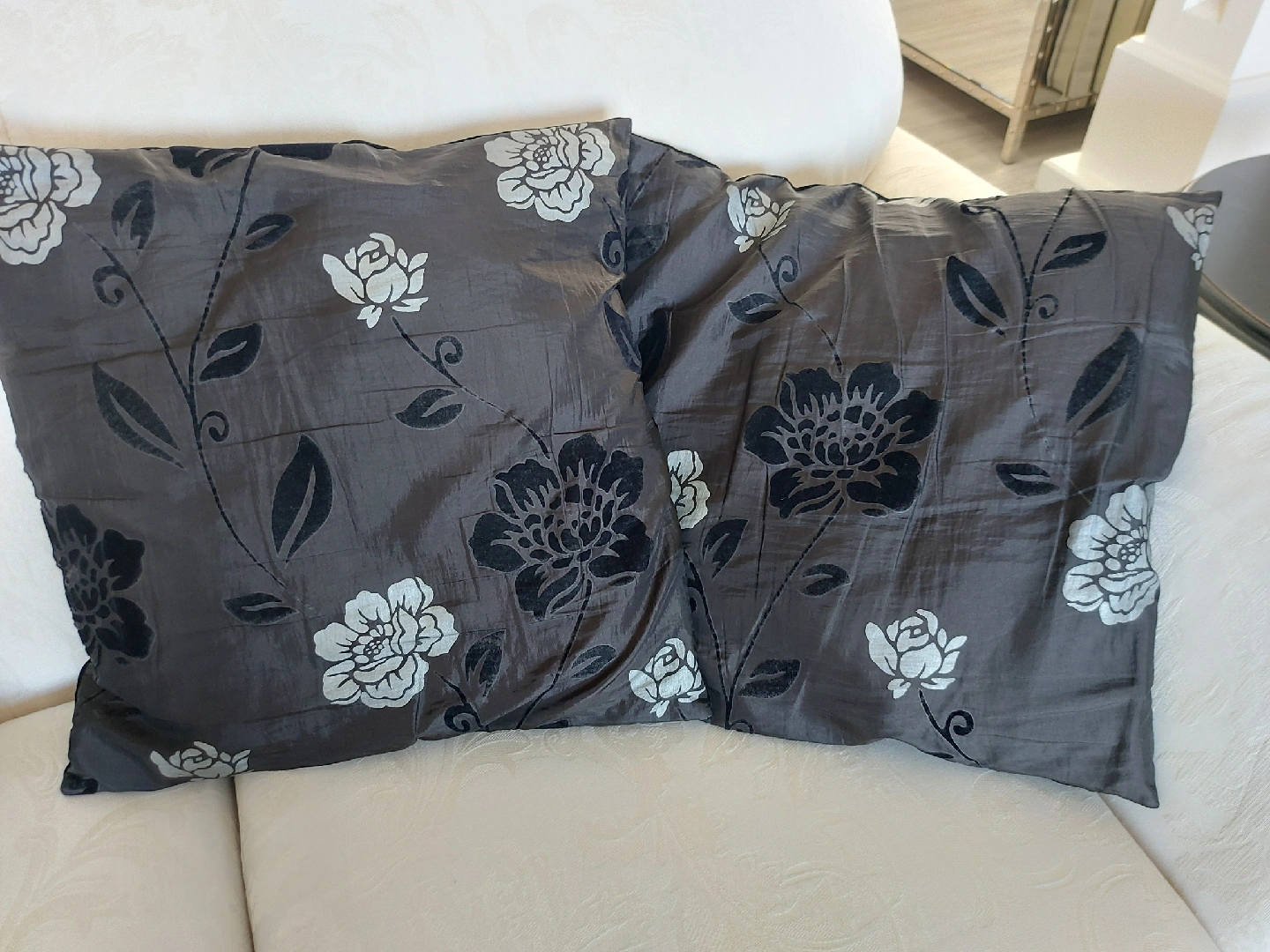 Selling a set of two reversable decorative pillows.! One side features a grey background with black and grey floral designs, while the other is a solid black velvet material. They're in good shape and would add a nice touch to any living space.