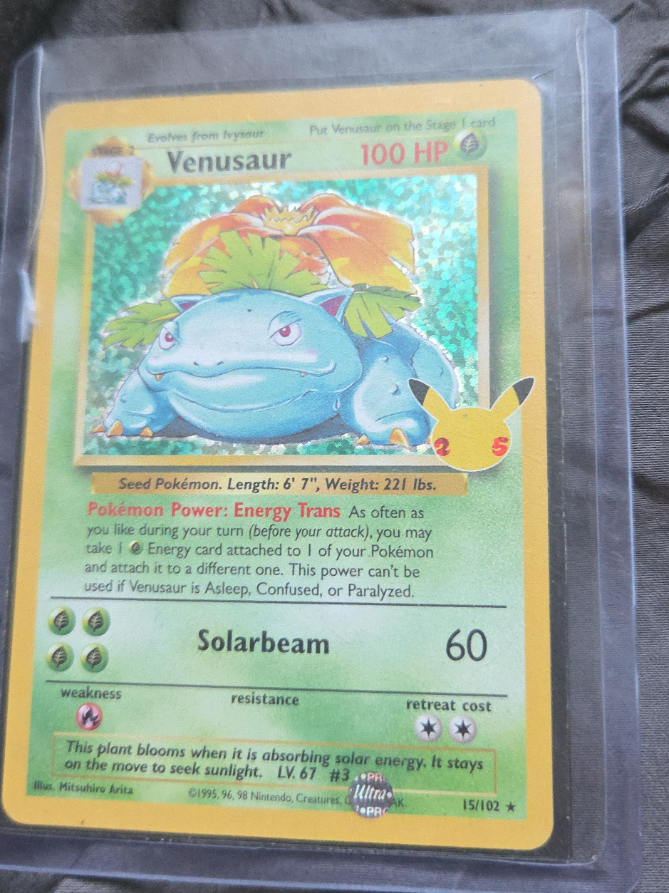 Selling a Venusaur Pokemon card. It's in great shape and ready for a new home. This card evolves from Ivysaur and has 100 HP. It's a Seed Pokémon with a length of 6' 7" and weight of 221 lbs. It also has the Pokémon Power: Energy Trans. It knows the move Solarbeam, which does 60 damage