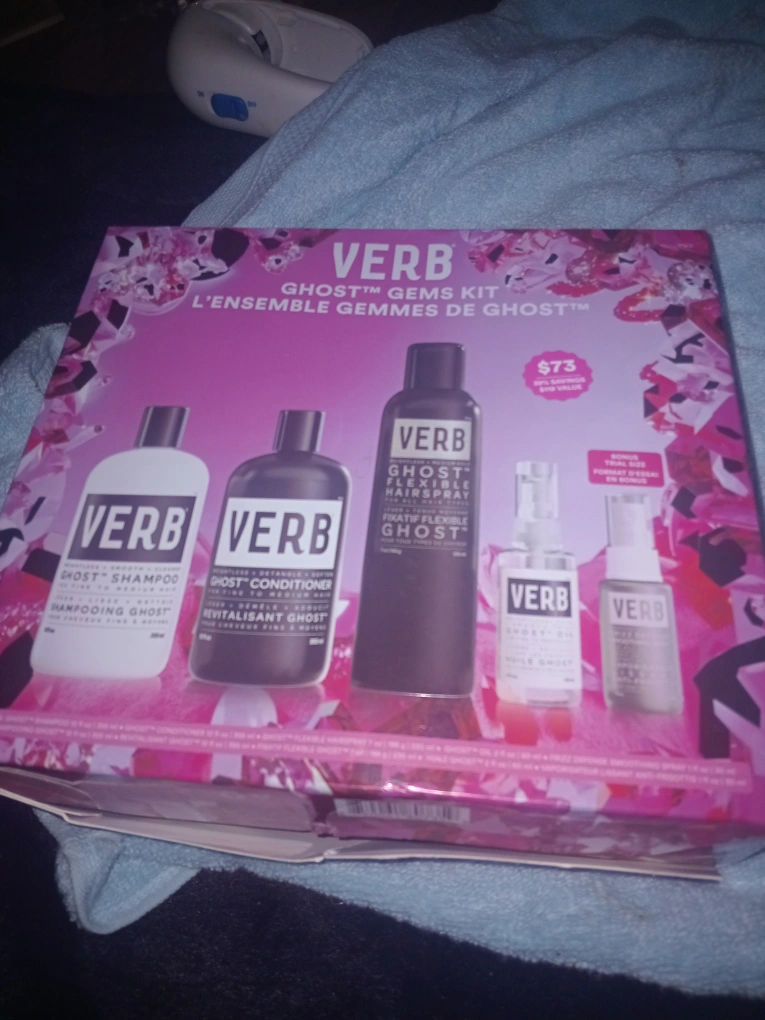 Selling a Verb Ghost Gems Kit! The box includes a shampoo, conditioner, hairspray, and other hair products. The box says it has a $73 product value