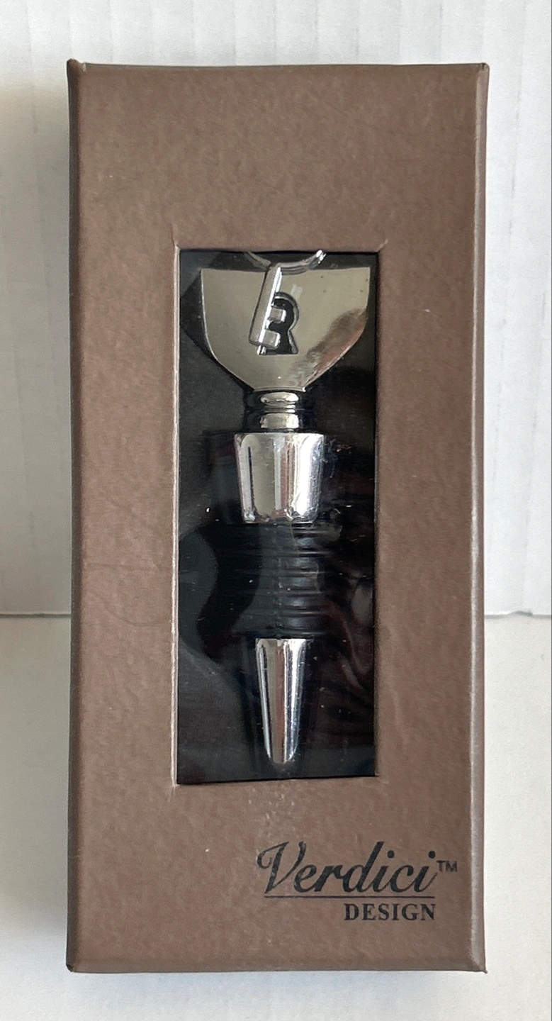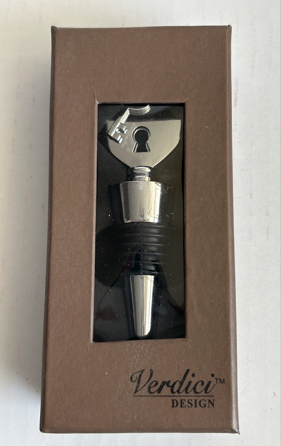 Silver-toned metal wine stopper. Features a heart-shaped top with a keyhole and lock design. Black rubber stopper. Comes in its original brown gift box. Excellent quality and good condition. Smoke and Pet free home. Cash/pick up only.