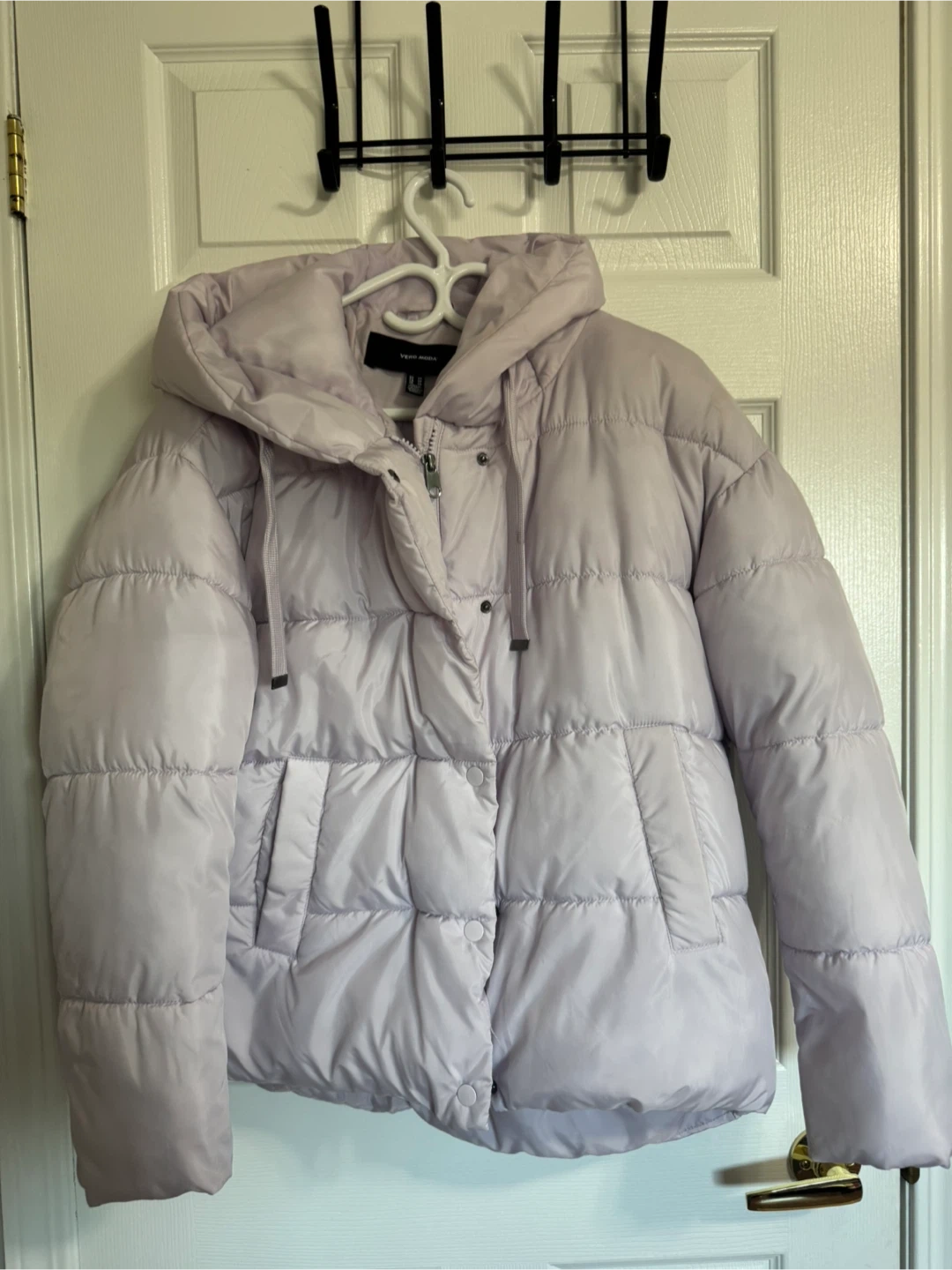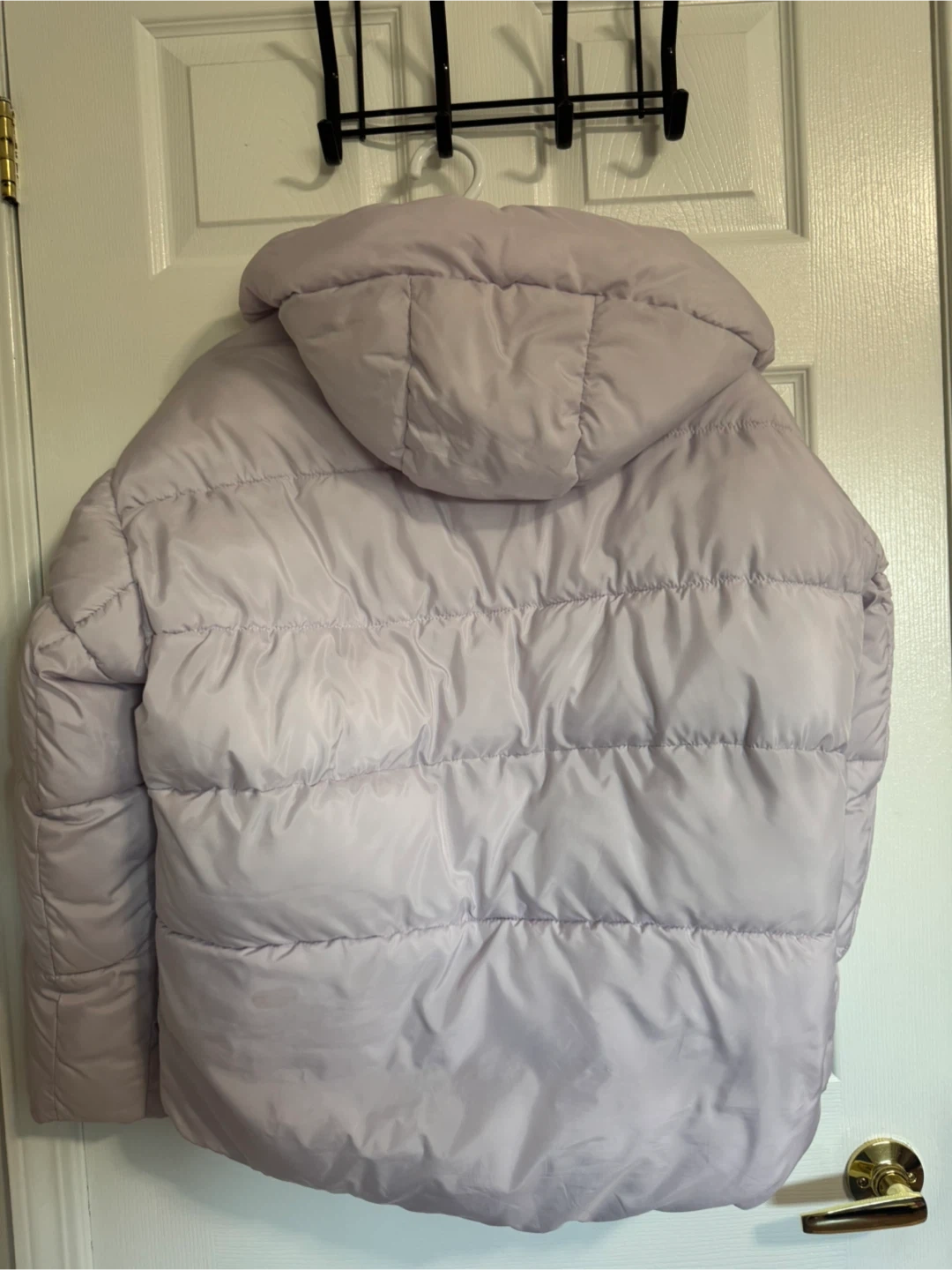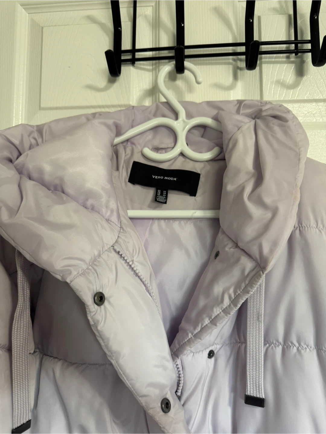 Selling a cute Vero Moda puffer jacket in a lovely lilac colour! It's a size medium and in great condition. Perfect for staying warm and stylish during the colder months. It features a hood and a button-up front.