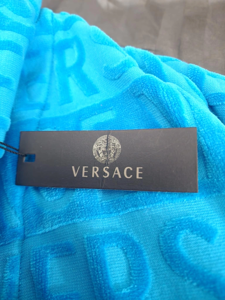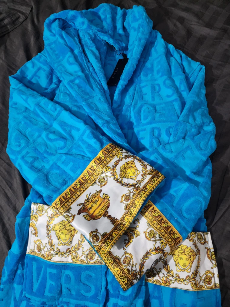 Selling a Versace bathrobe in a beautiful blue colour. The material is soft and plush, perfect for lounging around the house. It features the iconic Versace logo pattern throughout. A very stylish and luxurious piece! size: XL brand new with tags & dust bag.