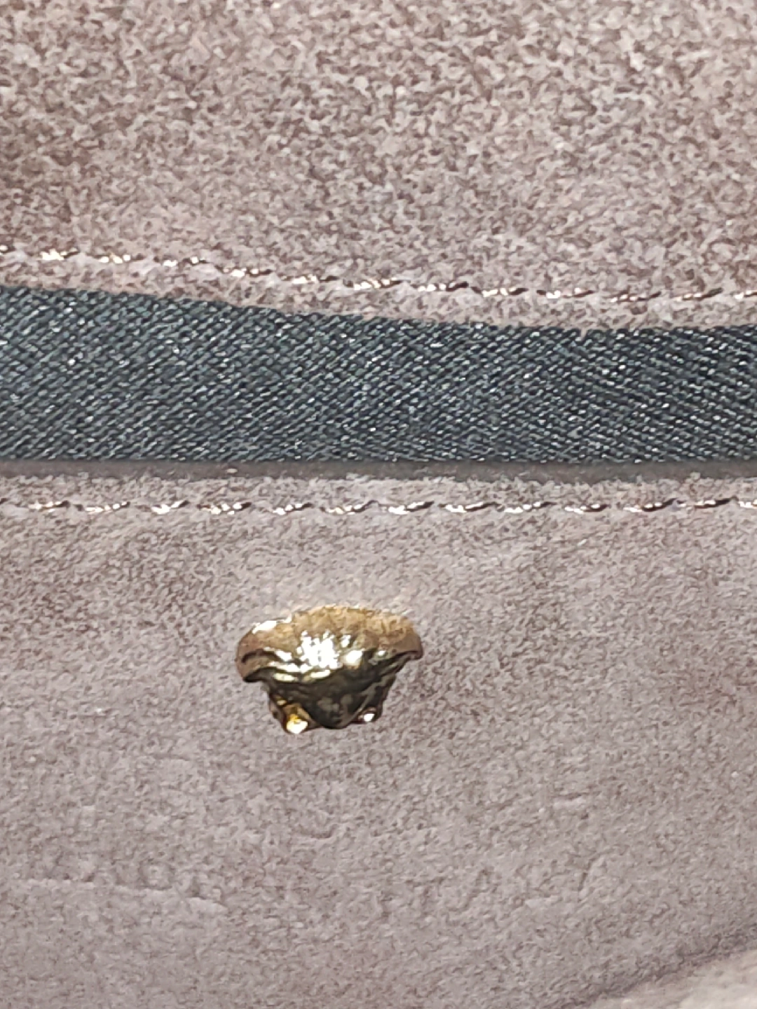 This is a beautiful Versace shoulder bag in a brown colour. It features all-over embellishments and a gold chain strap. Comes with the original Versace accessory card.