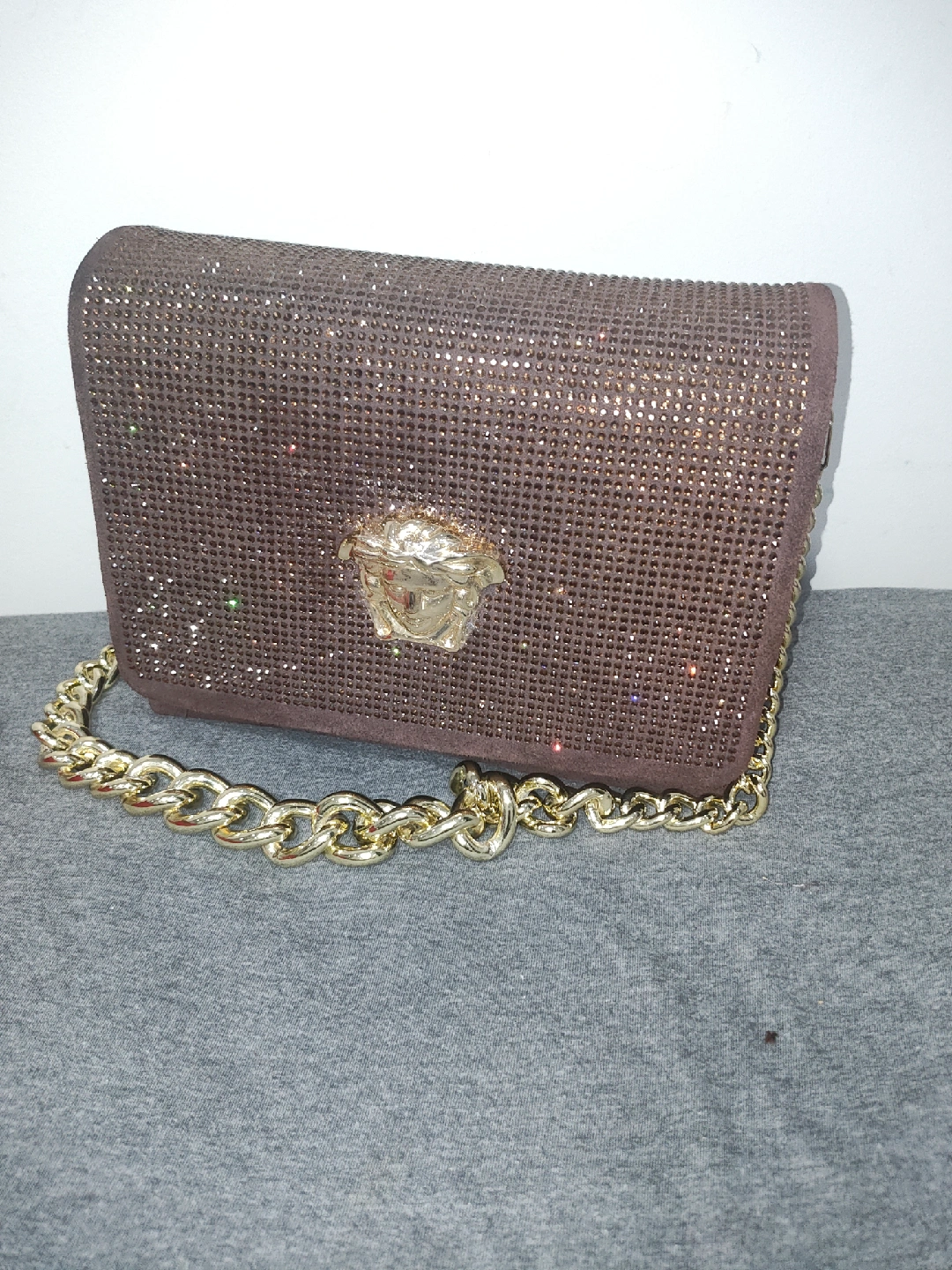 This is a beautiful Versace shoulder bag in a brown colour. It features all-over embellishments and a gold chain strap. Comes with the original Versace accessory card.