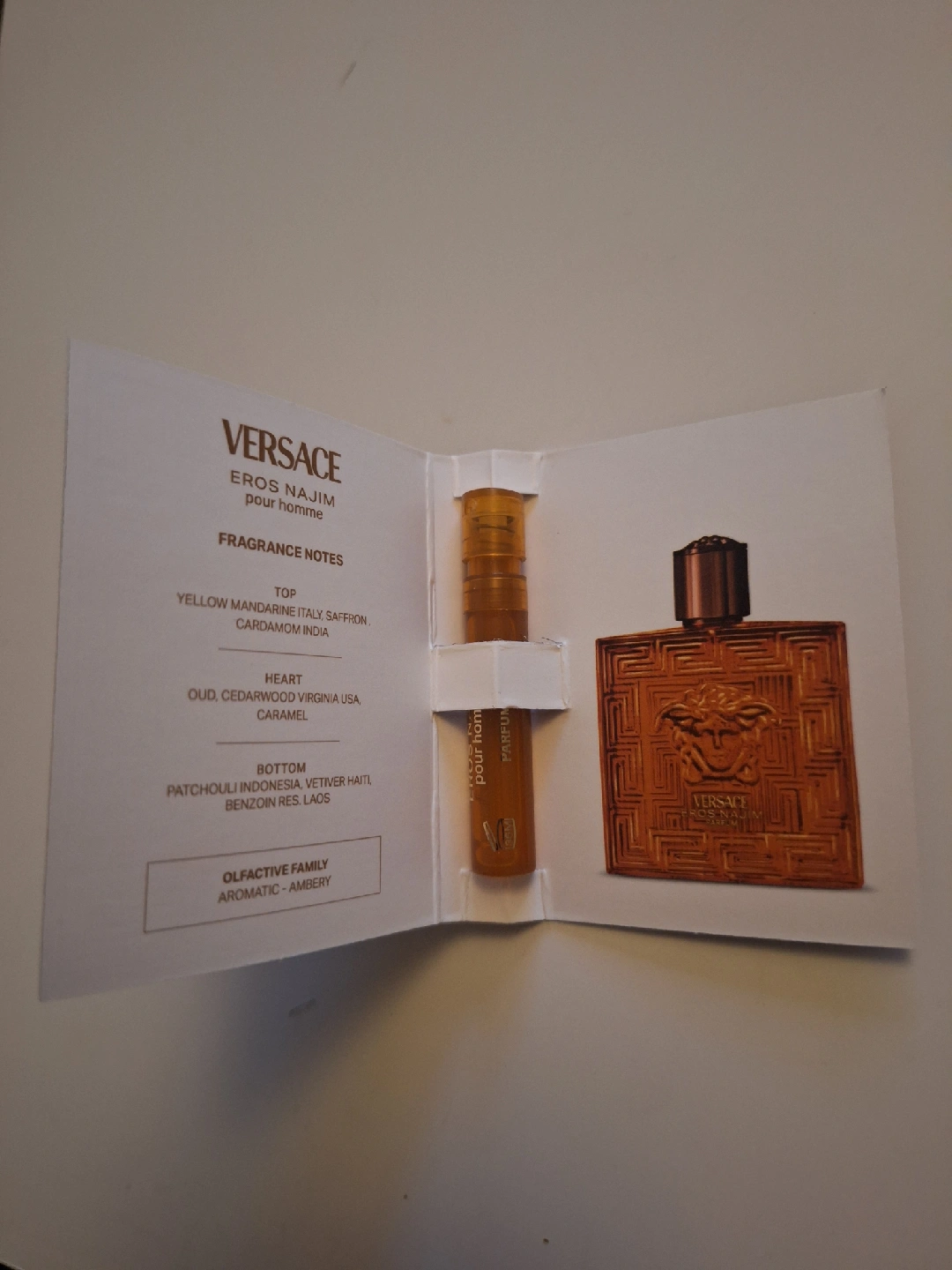 Selling a sample of Versace Eros Najim. It's a parfum natural spray with fragrance notes of yellow mandarin italy, saffron cardamom india, oud, cedarwood virginia usa, caramel, patchouli indonesia, vetiver haiti, and benzoin res. laos
