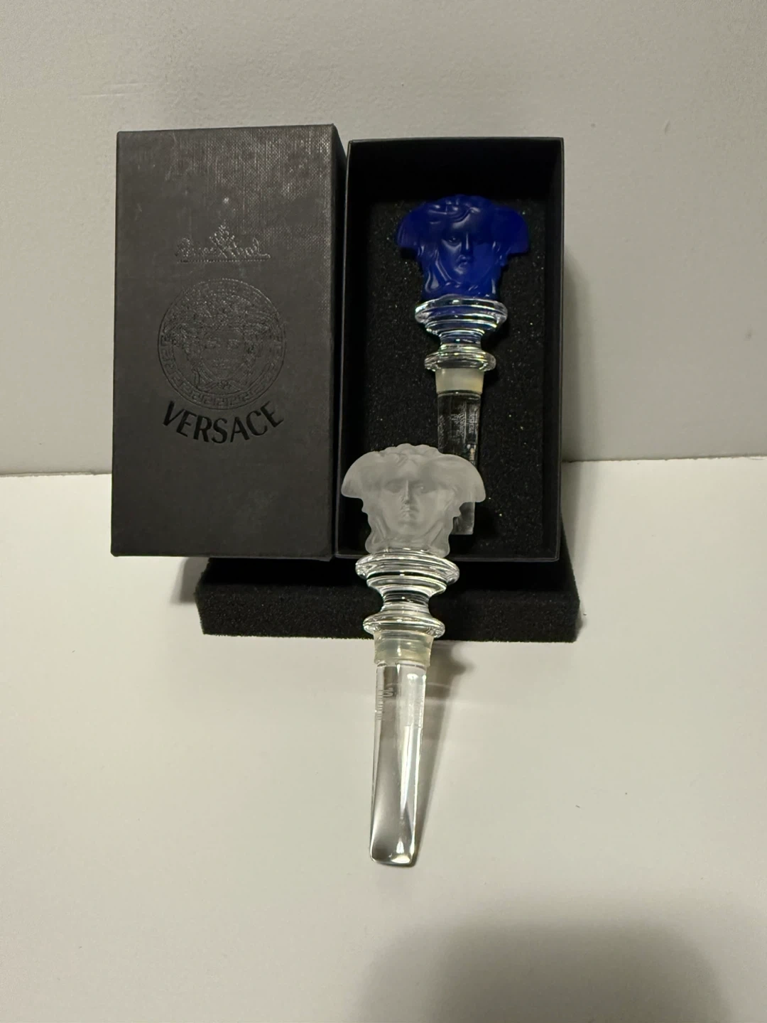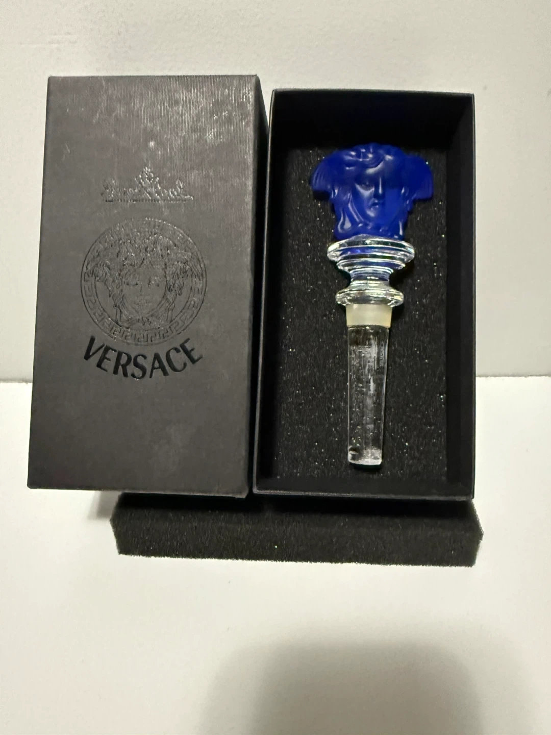 Selling a beautiful Versace Rosenthal crystal bottle stopper in blue! It comes with the original box. The stopper features the iconic Versace Medusa head design. Perfect for adding a touch of luxury to your barware collection! One blue and one white Only one with box