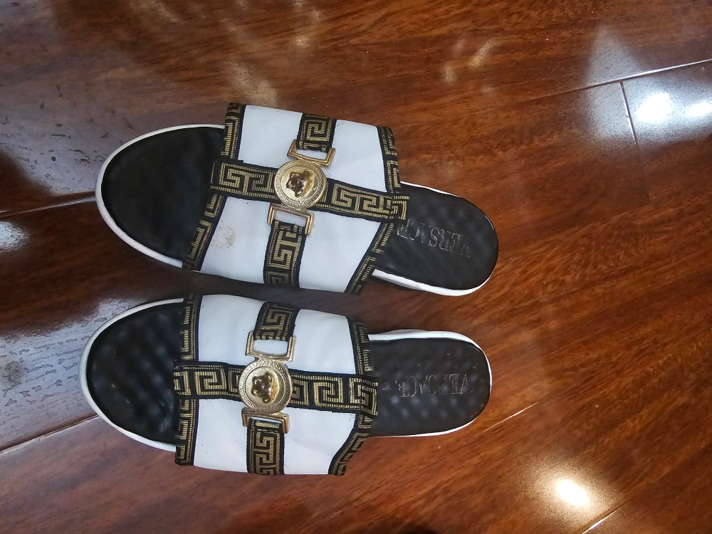 Versace slides in size 37. They feature a black and white colour scheme with gold detailing