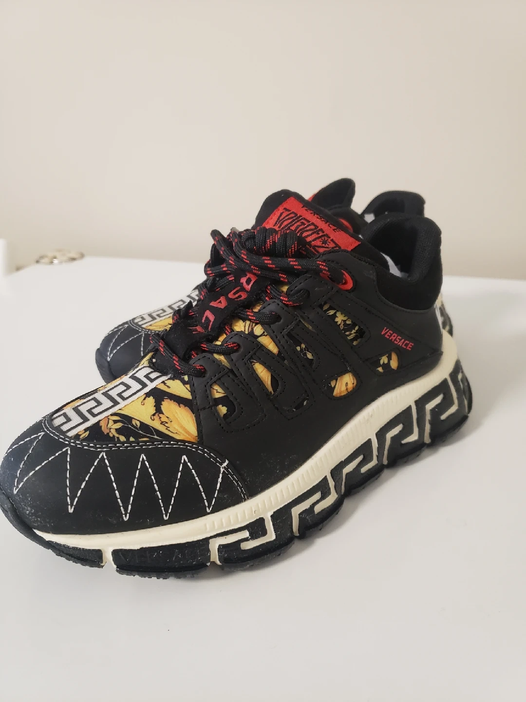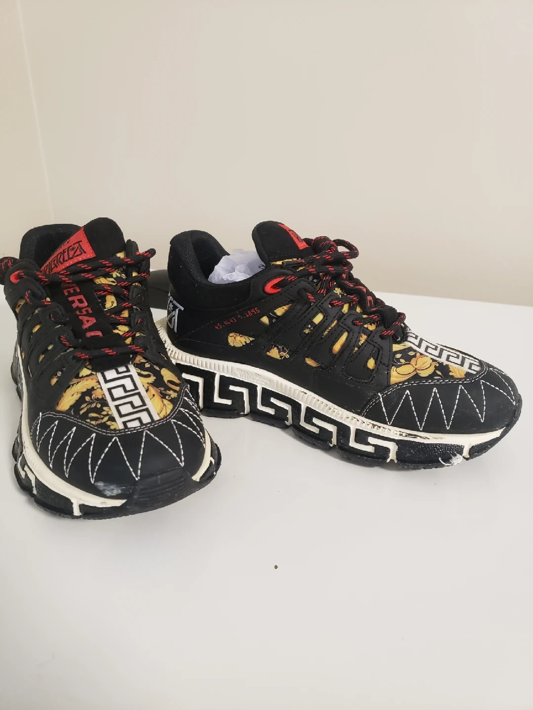 Selling a pair of Versace sneakers in size 38. They are black with red and gold accents. Barely used. Comes withbox and dust bag.