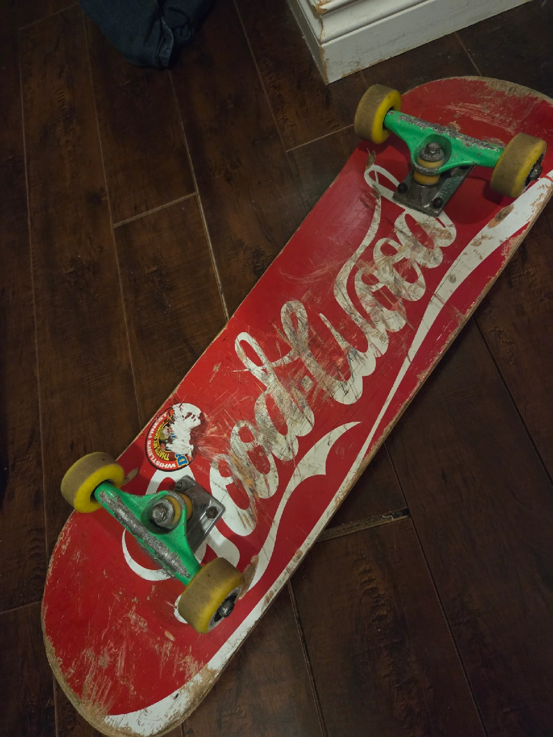 Selling extremely rare used skateboard with a Coca-Cola design spelling good wood (ie good weed). It has a red The trucks are green rucks and the wheels are yellow jaws. It has some wear and tear, as you can see in the pictures. text 236 512 5243