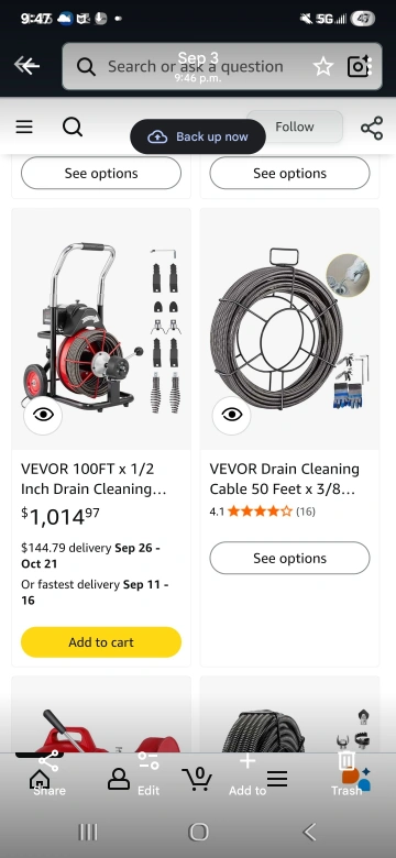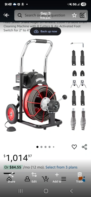 Looking to clear some clogged drains? I'm selling a VEVOR 100FT x 1/2 Inch Drain Cleaning Machine. It comes with 8 cutters and an air-activated foot switch for 2" to 4" pipes. Originally bought for $1,014.97Brand New used 1 time 15 mins