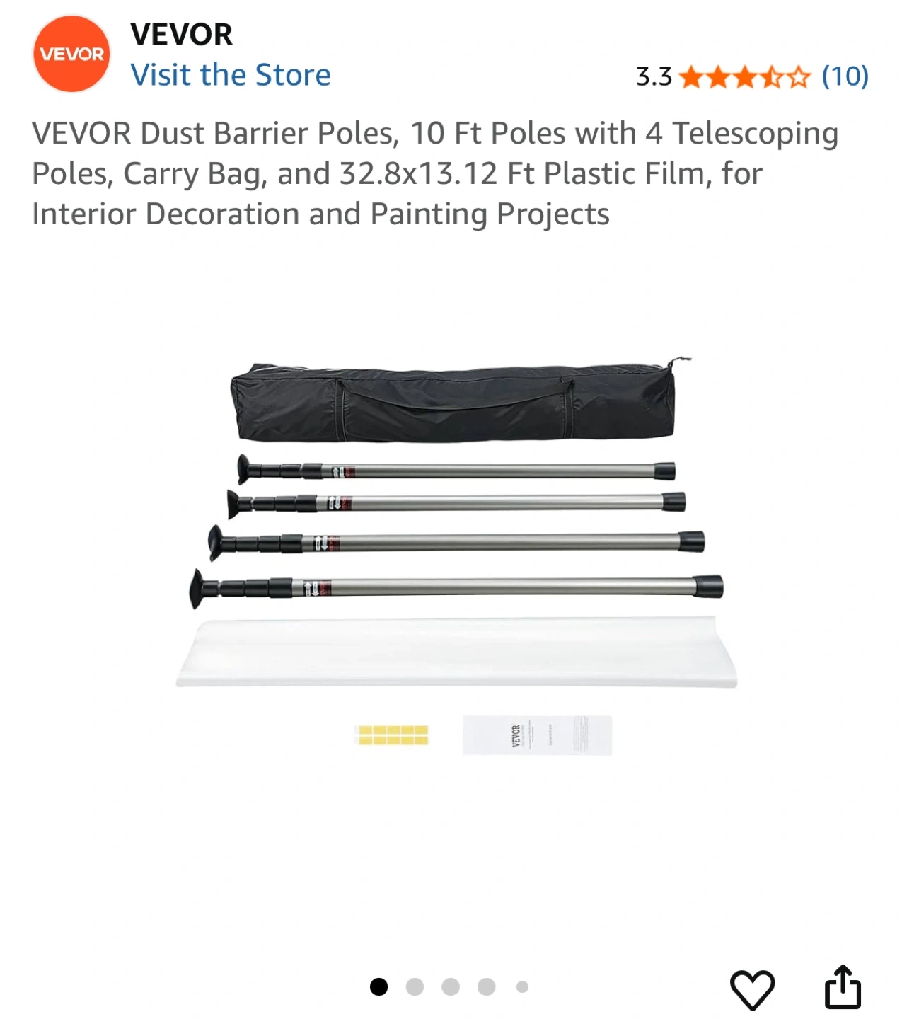 Selling a set of VEVOR dust barrier poles, each 10 ft long. This set includes 4 telescoping poles, a carry bag, and a 32.8x13.12 ft plastic film. Great for interior decoration and painting projects!