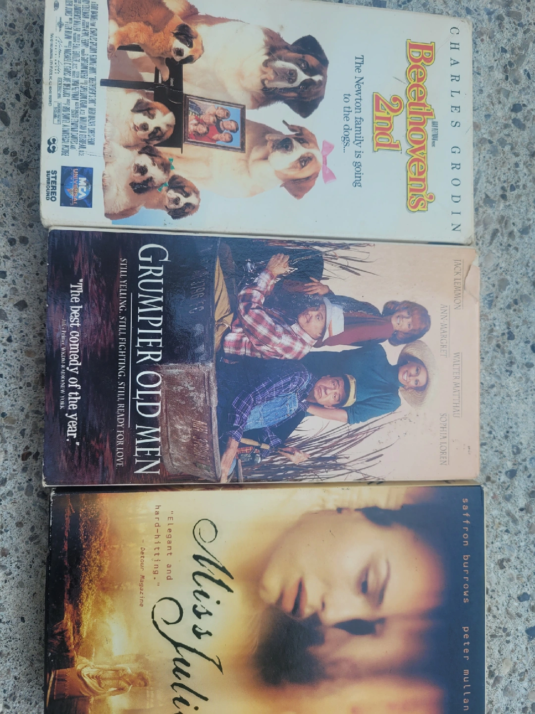 Selling a collection of VHS tapes! Includes Beethoven's 2nd starring Charles Grodin, Grumpier Old Men with Walter Matthau and Sophia Loren, and Miss Julie starring Saffron Burrows and Peter Mullan. All in good condition for their age! $1 each.