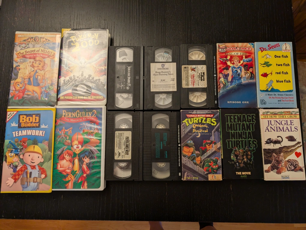 Selling a collection of VHS tapes! Titles include The Secret of NIMH 2, Pokemon 2000, Bob the Builder: Teamwork, Ferngully 2: The Magical Rescue, Jurassic Park, Fievel Goes West, Bugs Bunny's Hare-Raising Tales, Hot Wheels World Race Ring of Fire, Dr. Seuss One Fish Two Fish, and Teenage Mutant Ninja Turtles.