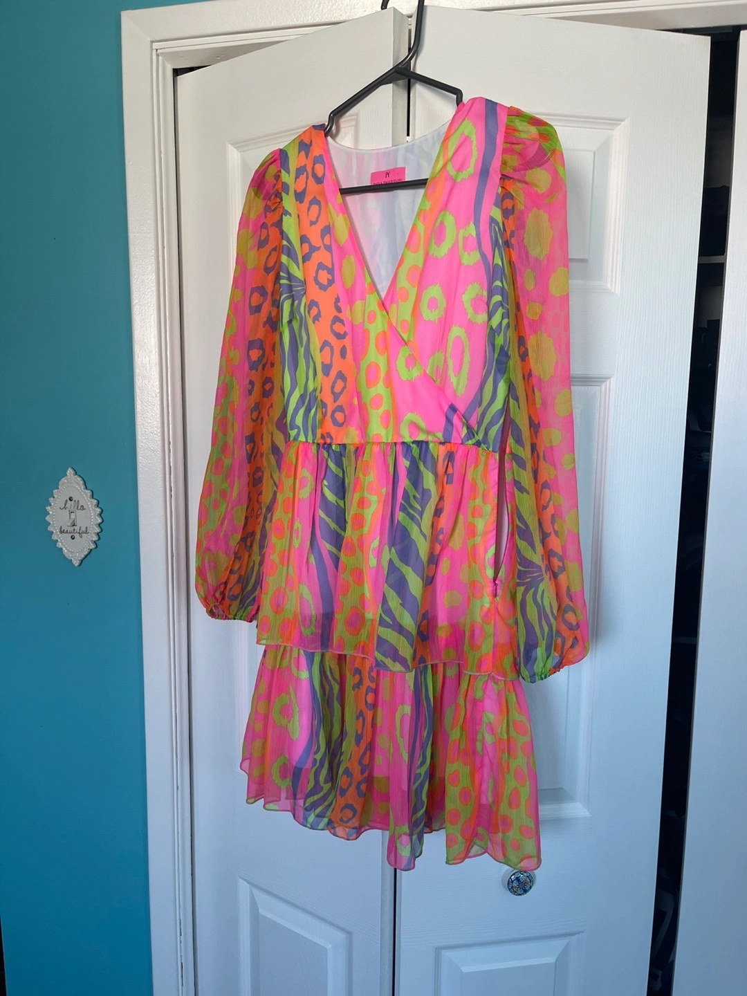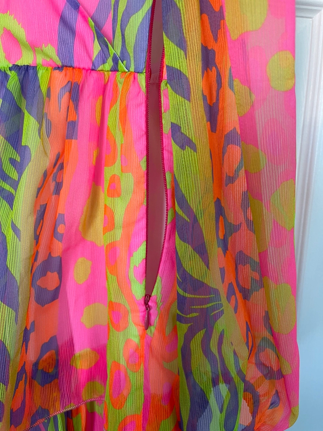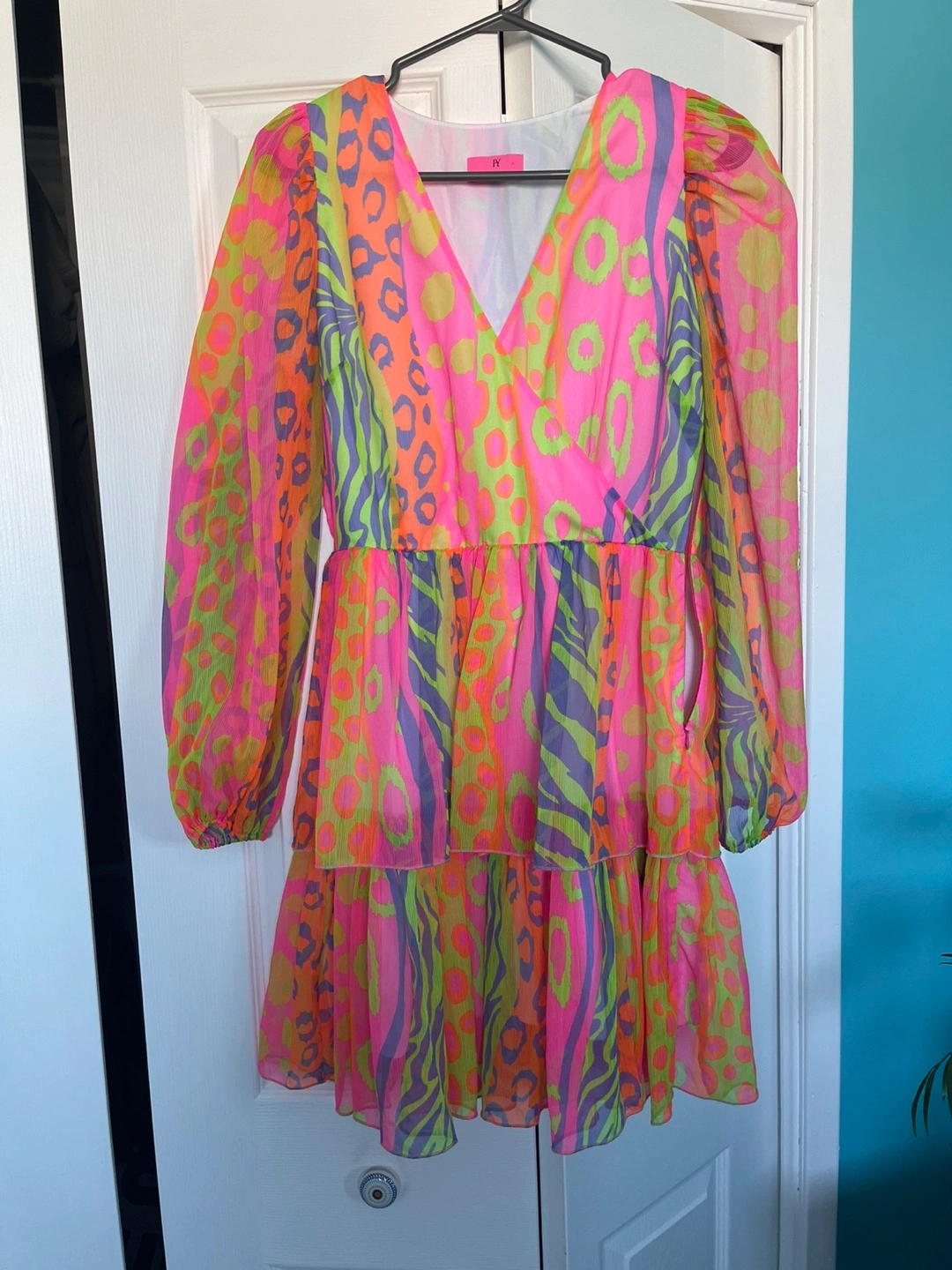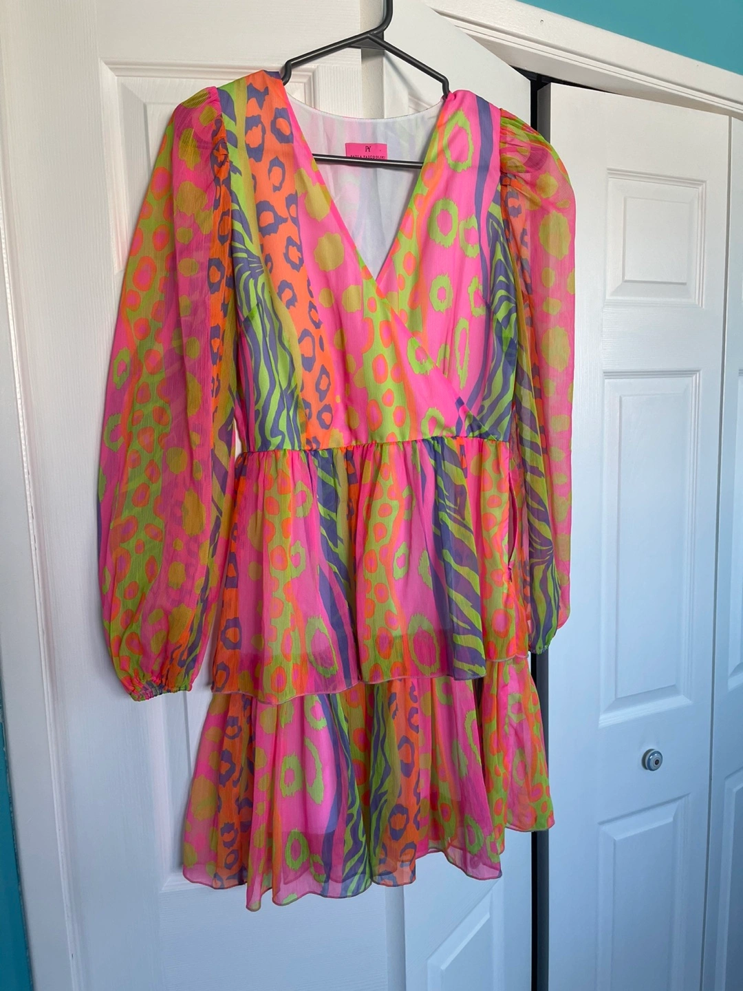 Long sleeve mini dress. Features a V-neck and tiered skirt. Pink, green, purple and orange animal print. Brand new. Ordered from Europe. Designer dress. Small size but for me more like Medium. Too big for me unfortunately. Very pretty and original. For a woman who likes colors and original design. A sewn-in zipper on the side makes it easier to put on and take off the dress.