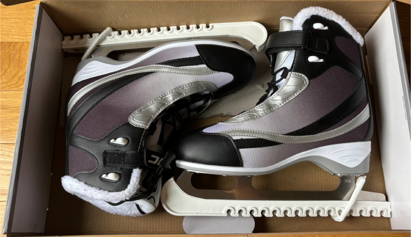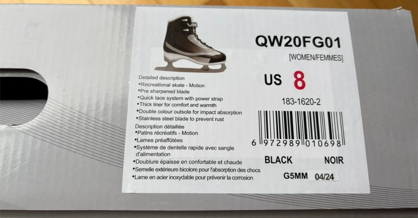 Selling a pair of VIC women's figure skates in US size 8! These skates are in like-new condition and come in the original box. They feature a recreational skate motion, pre-sharpened blade, quick lace system with power strap, and a thick liner for comfort and warmth. The outsole is double-coloured for impact absorption, and the blade is stainless steel to prevent rust. These are ready to hit the ice. Cash only Firm price Pick up only If add is on, it is available