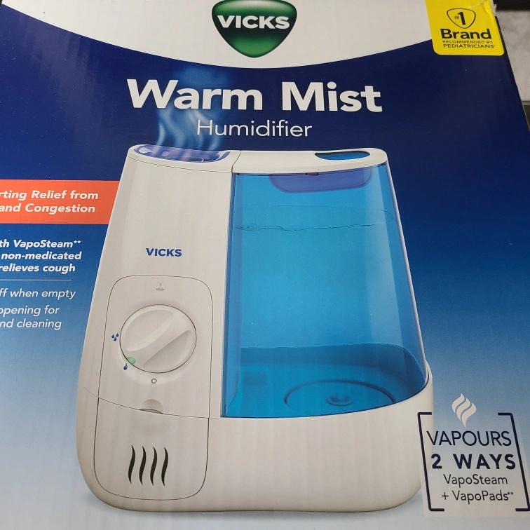 I'm selling a Vicks Warm Mist Humidifier. It provides relief from cold and congestion. It can be used with VapoSteam and VapoPads. It also shuts off when empty and has a wide opening for easy cleaning