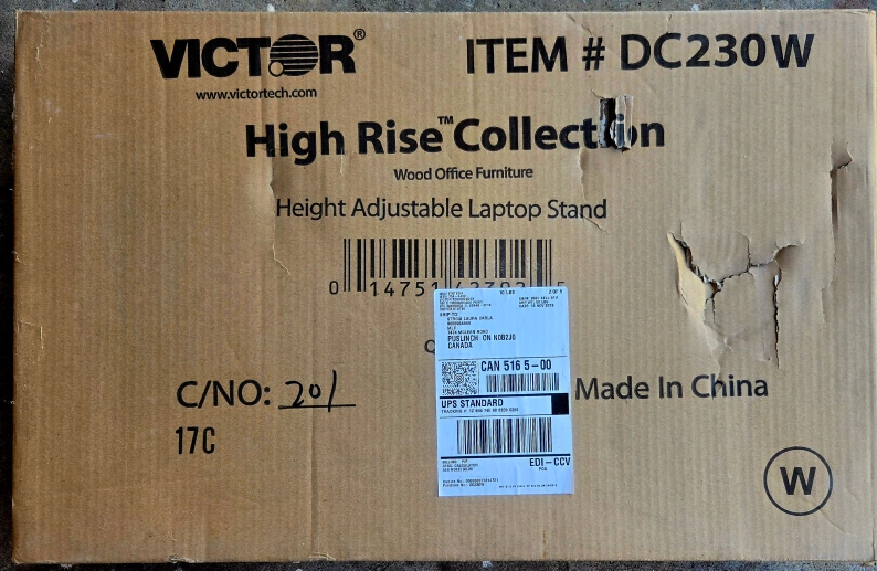 Selling a Victor High Rise Collection height adjustable laptop stand. It's a wood office furniture item, model number DC230W. Packaging box is slightly damaged but rest assured the product inside is brand new.