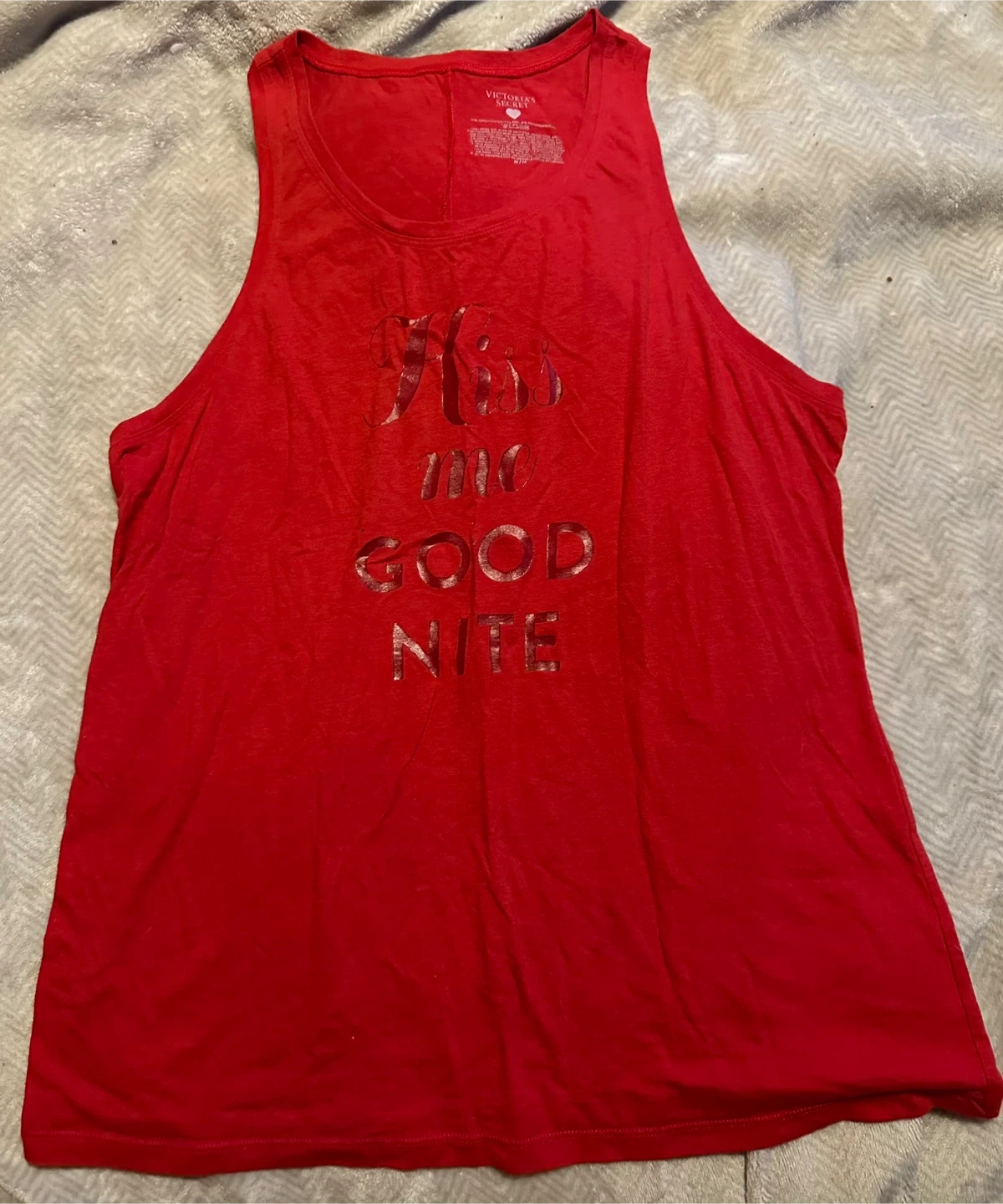 Selling a red tank top from Victoria's Secret. It's a size M and has the words "Kiss me GOOD NITE" on the front