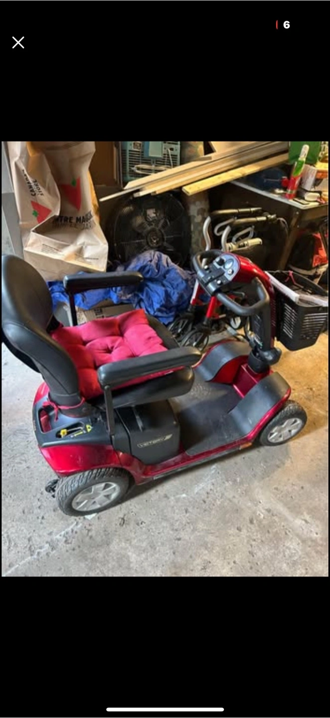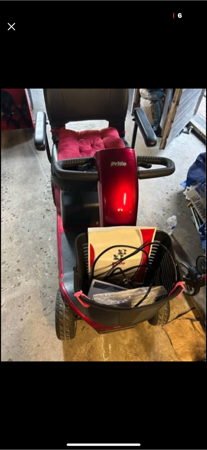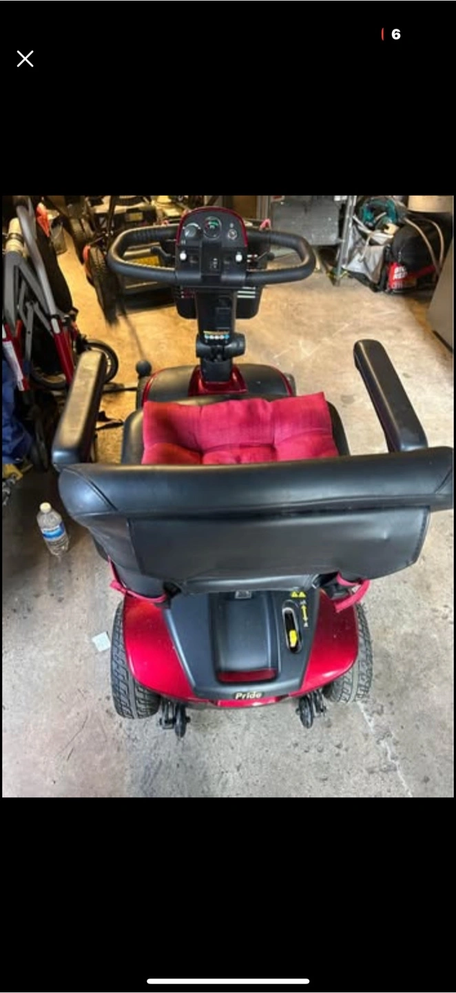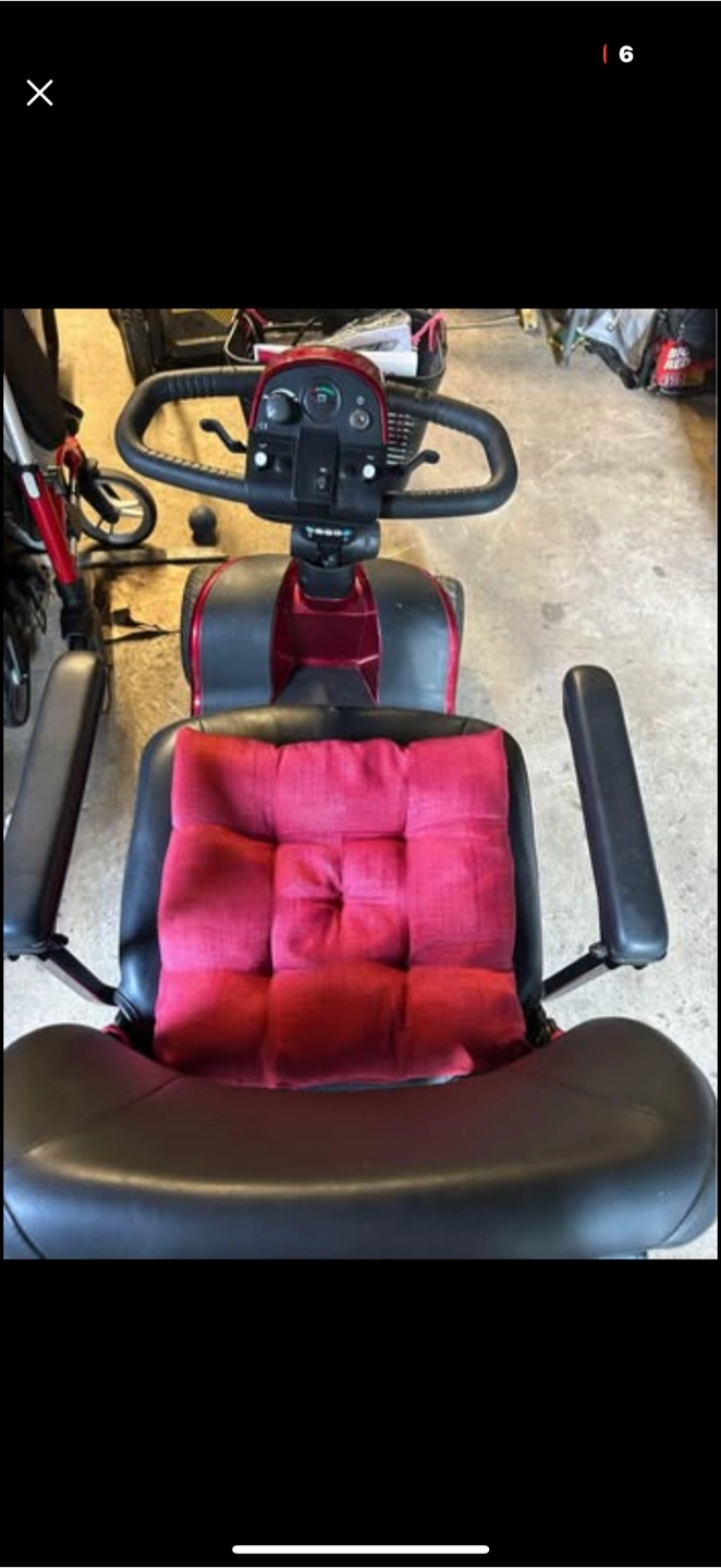A mobility scooter. Features a red and black colour scheme. Comes with a basket. Has padded armrests. Consider this for easy and effortless navigation.