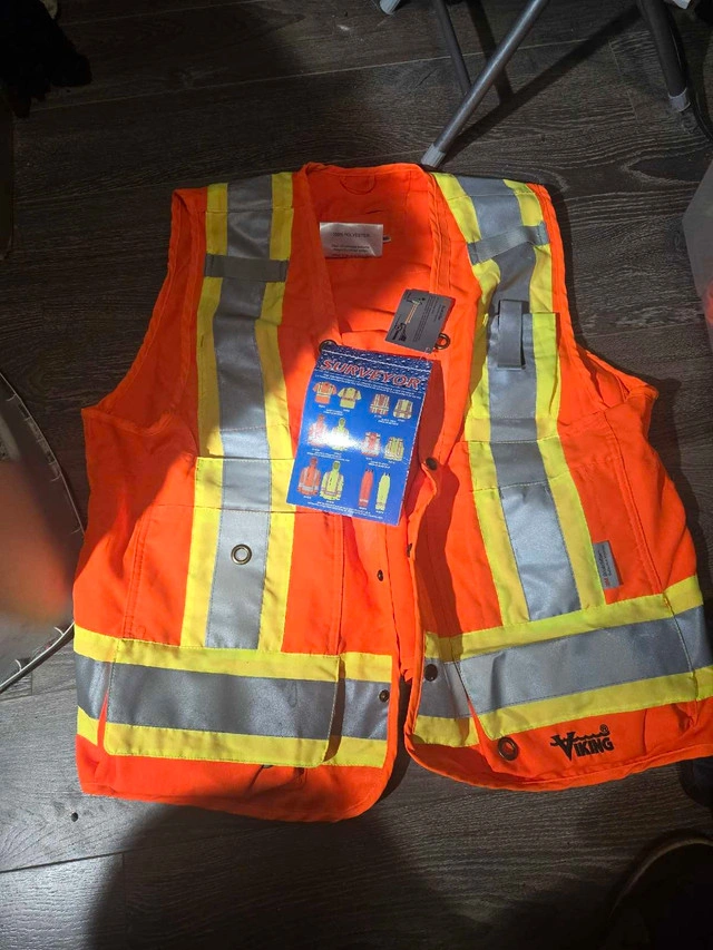 This Viking reflective work vest is designed to enhance visibility and safety on the job, featuring bright orange material with reflective stripes. It is in used condition, showing signs of wear but remains fully functional. This vest is perfect for construction workers, traffic controllers, or anyone needing high visibility. Key Features: * High-visibility orange material * Reflective stripes for enhanced visibility * Durable construction. This item is available if the ad is up!