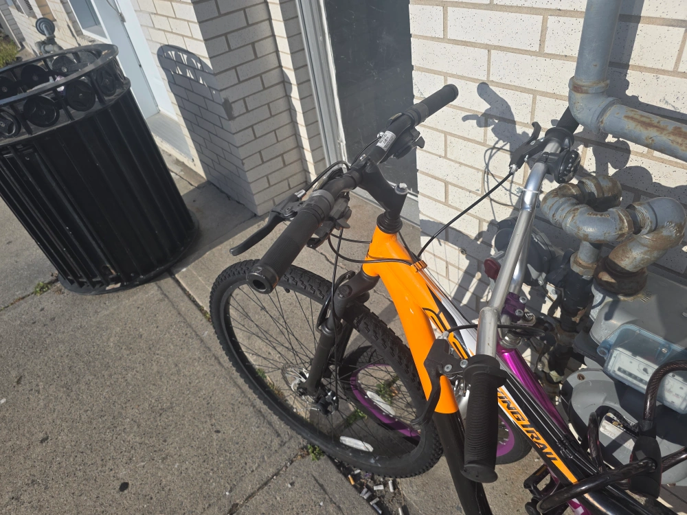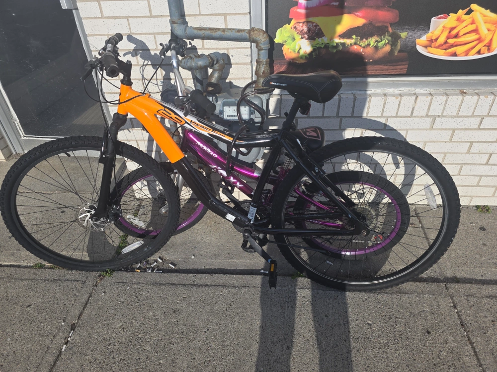 Two bikes available: a Viking Trail and a Galaxy XX. Both are in good condition and ready to ride! The Viking Trail has an orange front fork, while the Galaxy XX is purple and black.