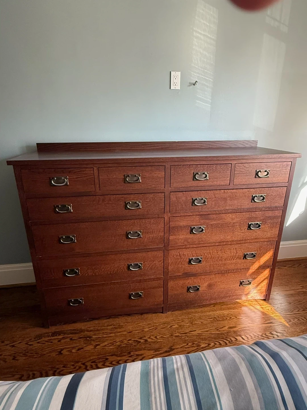 Original solid piece Villageois Mission Style set. Solid one piece design, beautifully crafted. Purchased directly from Villageois (if you know, you know!). Dresser dimensions are 66w” x 19d” x 44”. 2 Bed side tables (we have both) are 24w” x 19d” x 27” height. Selling together or may consider selling pieces separately.