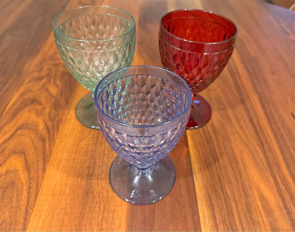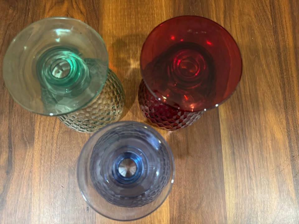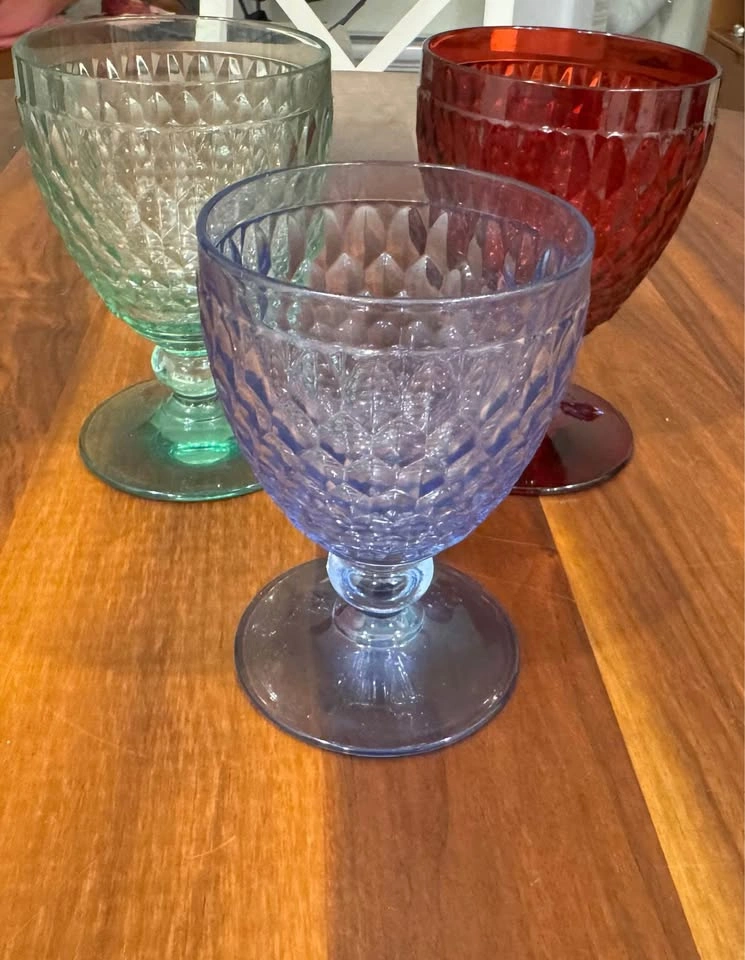 Beautiful cut design, solid quality crystal glass. • 2 Boston Water Goblets (Red & Green, 250 ml) • 1 Boston Red Wine Glass (Blue, 200 ml) Excellent condition, no chips or cracks. All 3 glasses together for $50.