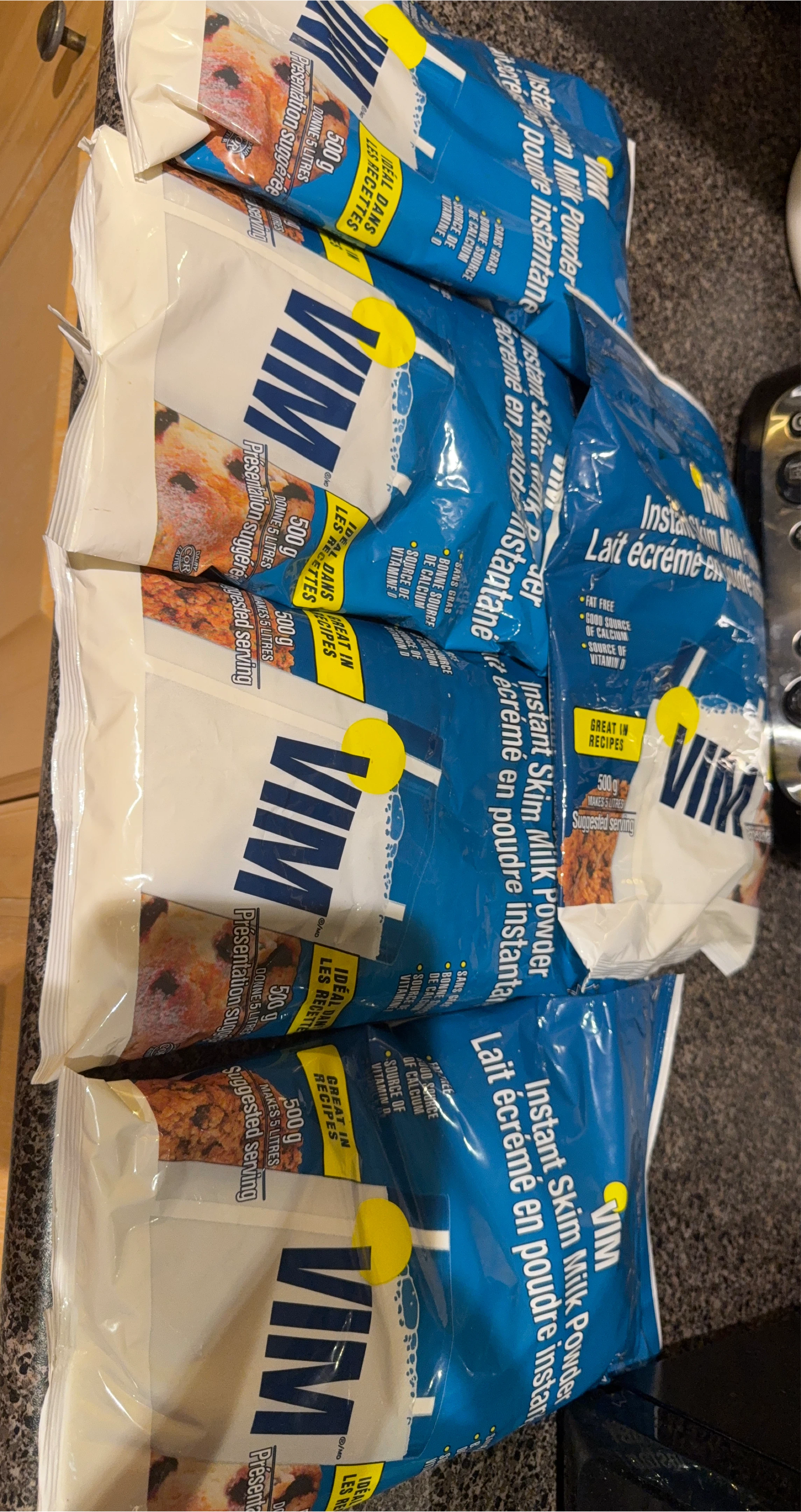 Selling 5 bag of VIM Instant Skim Milk Powder, 500g size! It's great in recipes and is a good source of calcium and Vitamin D. Perfect for adding to your baking or morning coffee! Expiry date is April 2926 retail is $12 each