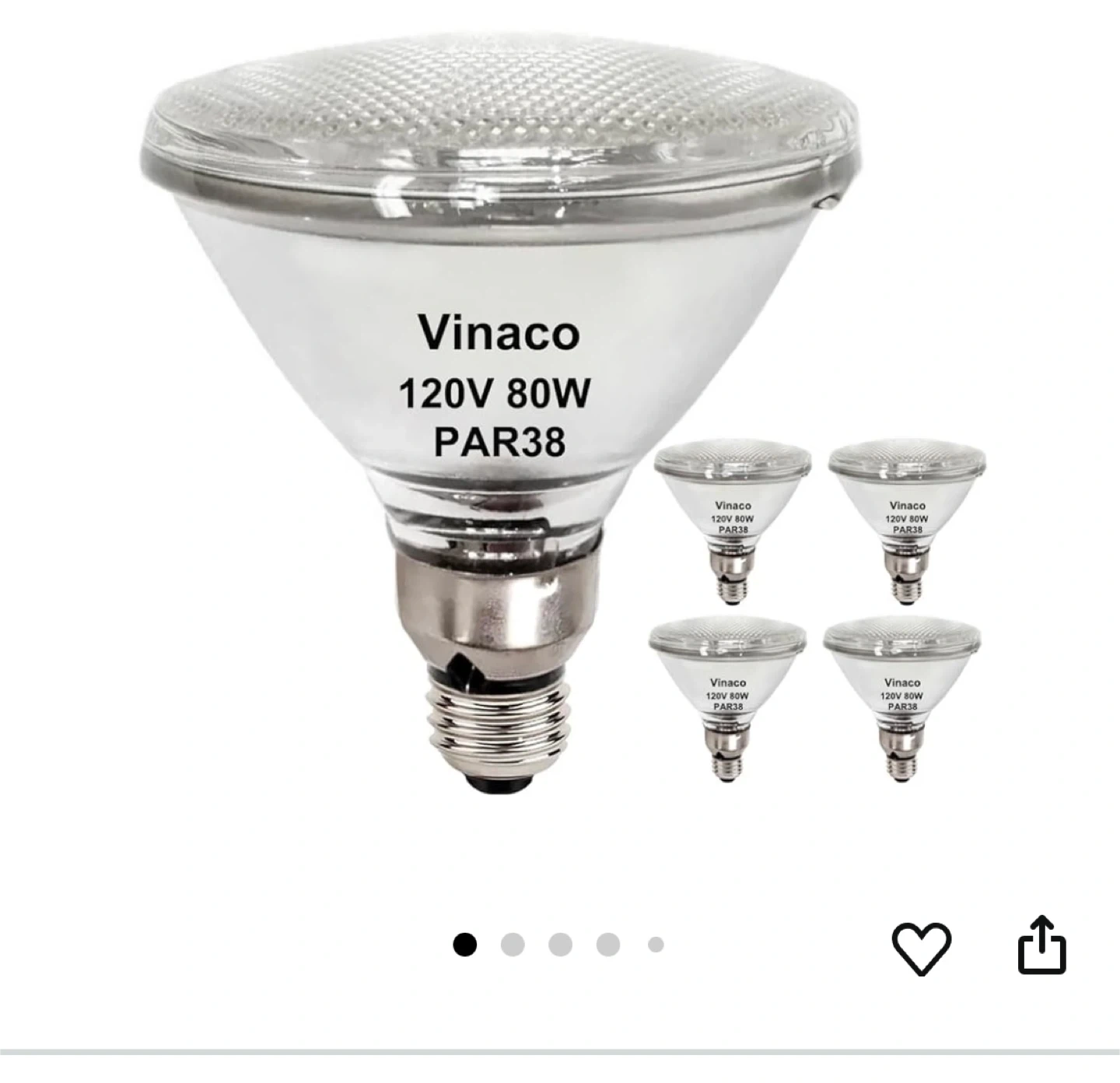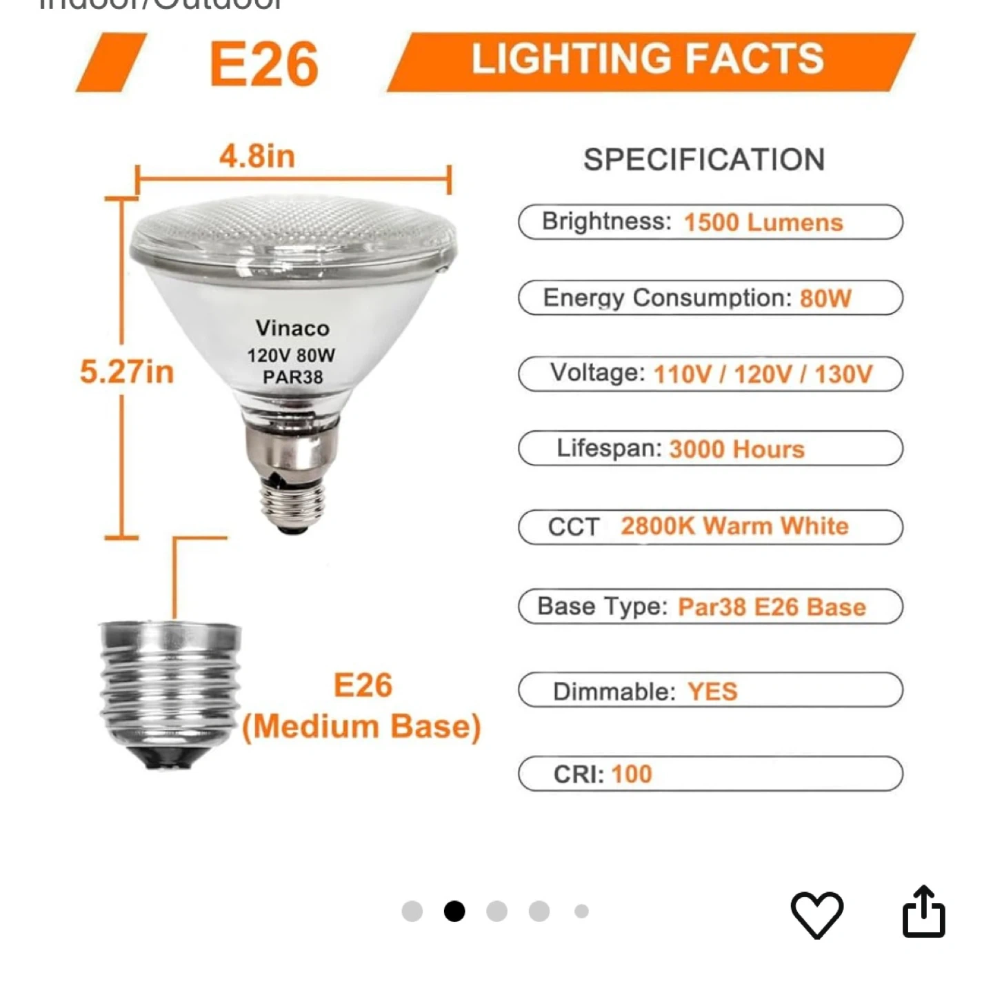 Selling a Vinaco 120V 80W PAR38 E26 light bulb. Key specs: - Brightness: 1500 Lumens - Energy Consumption: 80W - Voltage: 110V/120V/130V - Lifespan: 3000 Hours - CCT: 2800K Warm White - Base Type: Par38 E26 Base - Dimmable: YES - CRI: 100
