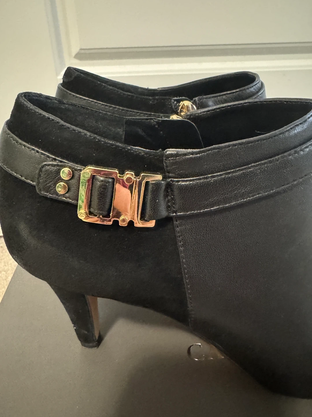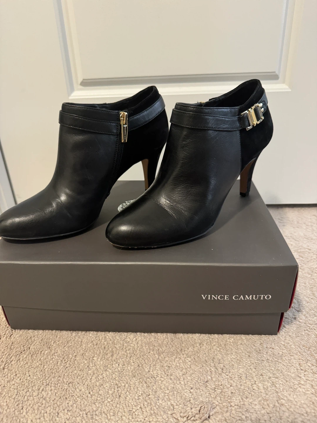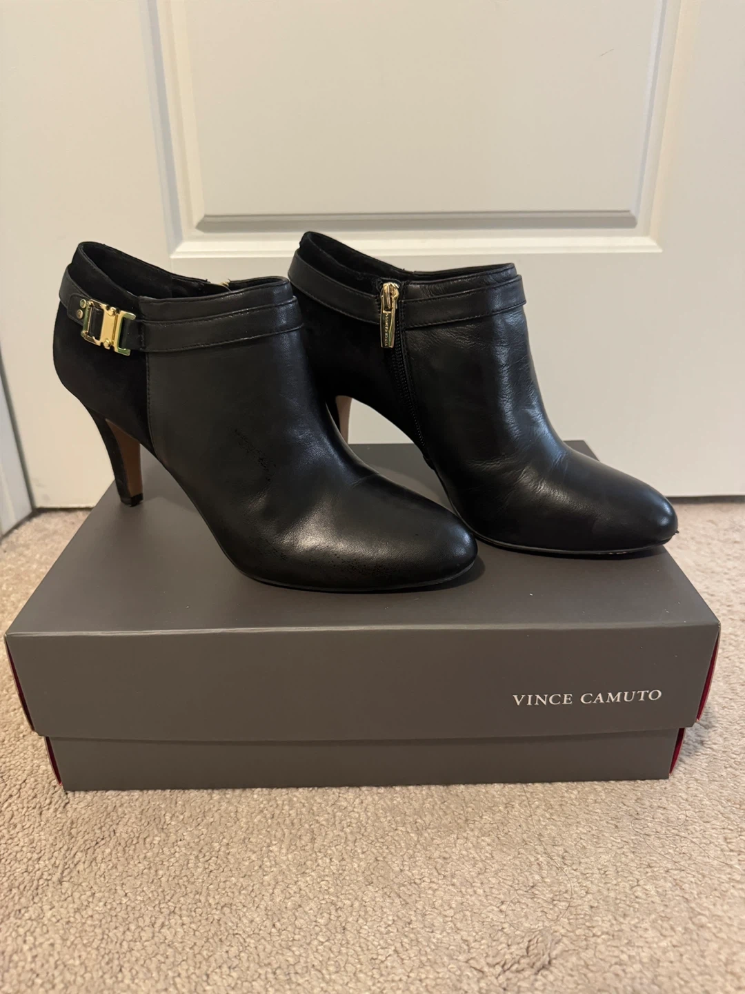 These Vince Camuto heeled booties are in great shape and come with the box! They're black leather with a suede accent and a gold buckle detail. Perfect for dressing up or down!
