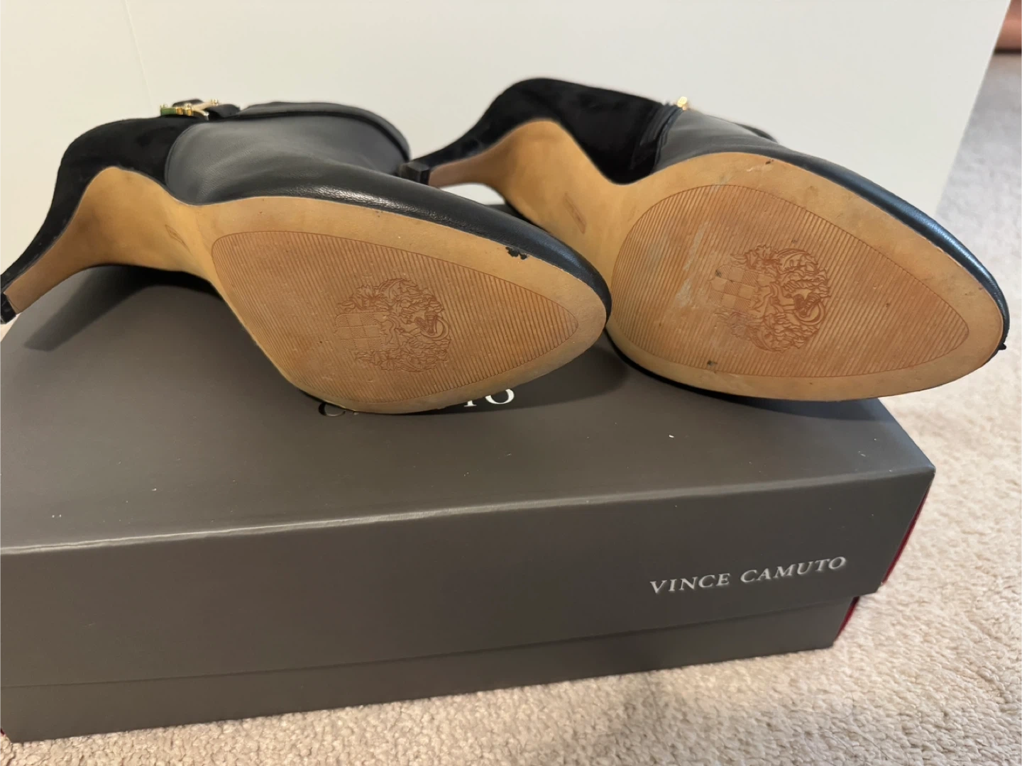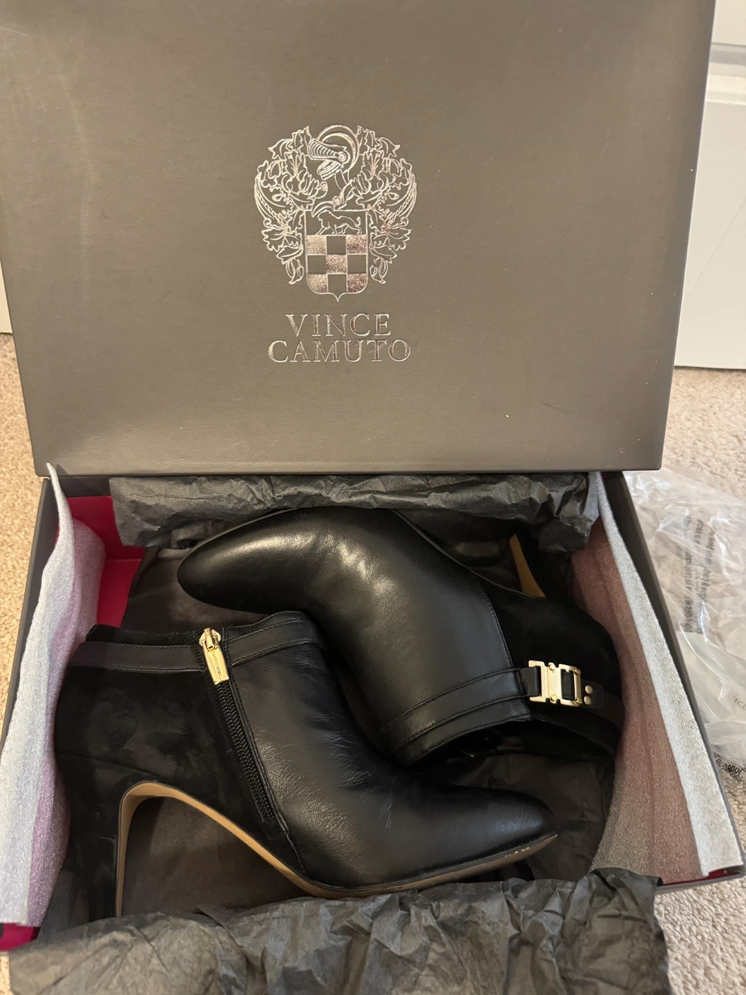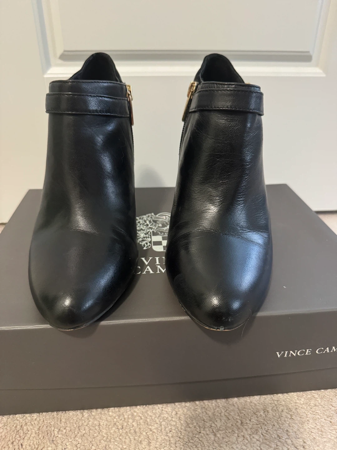 These Vince Camuto heeled booties are in great shape and come with the box! They're black leather with a suede accent and a gold buckle detail. Perfect for dressing up or down!