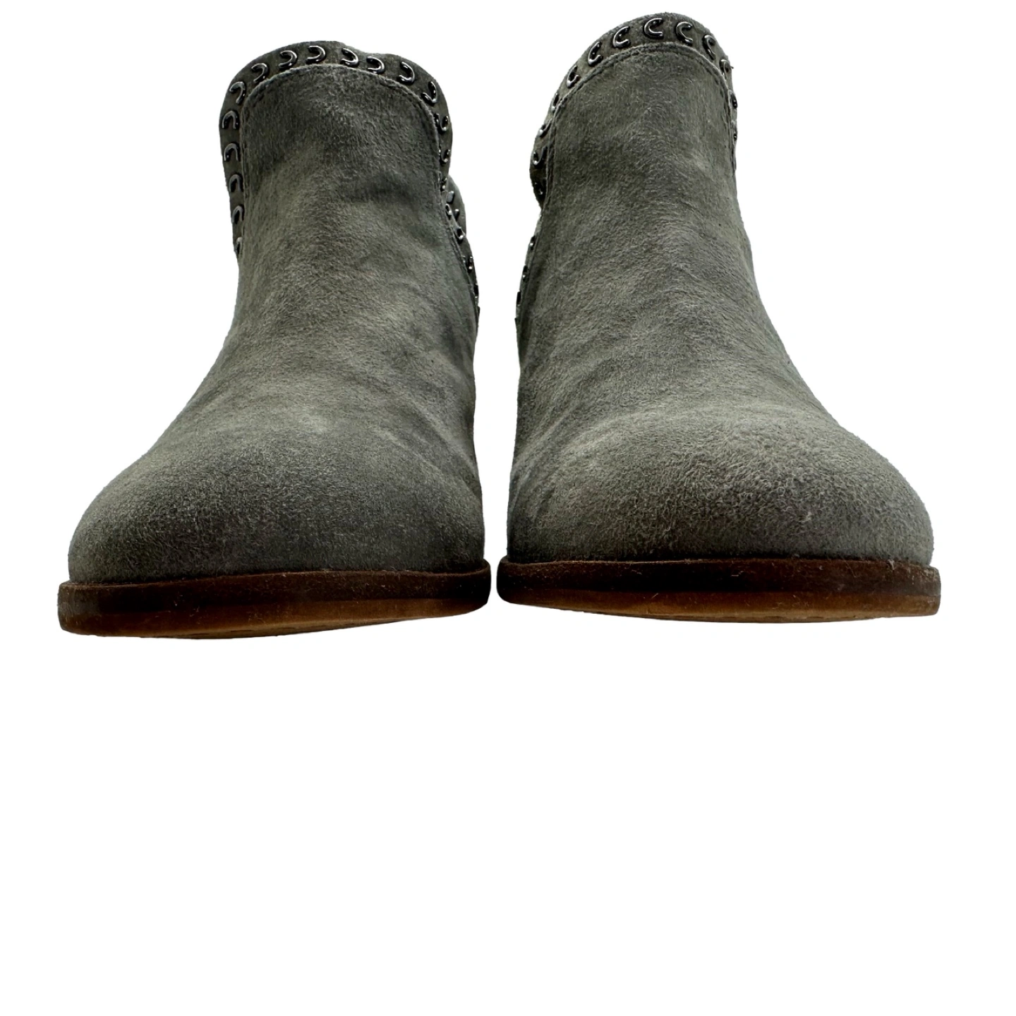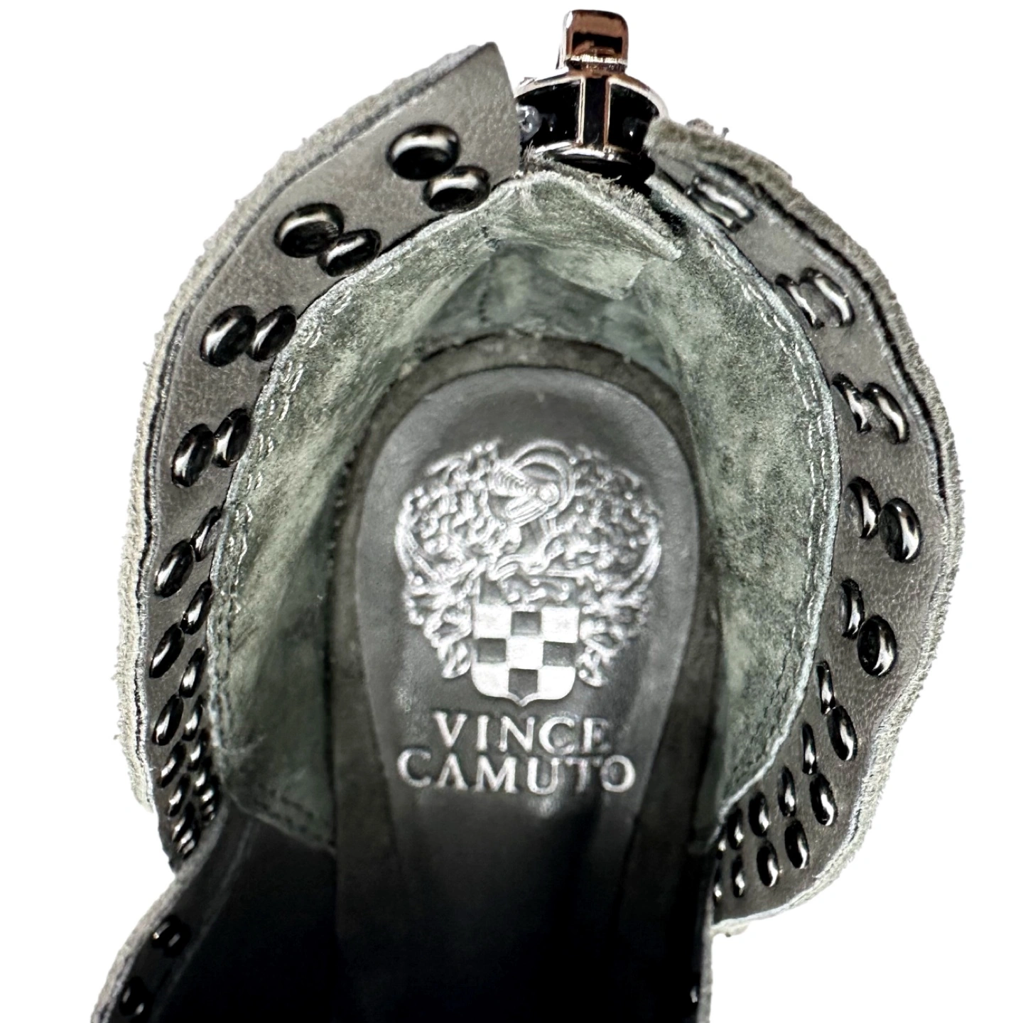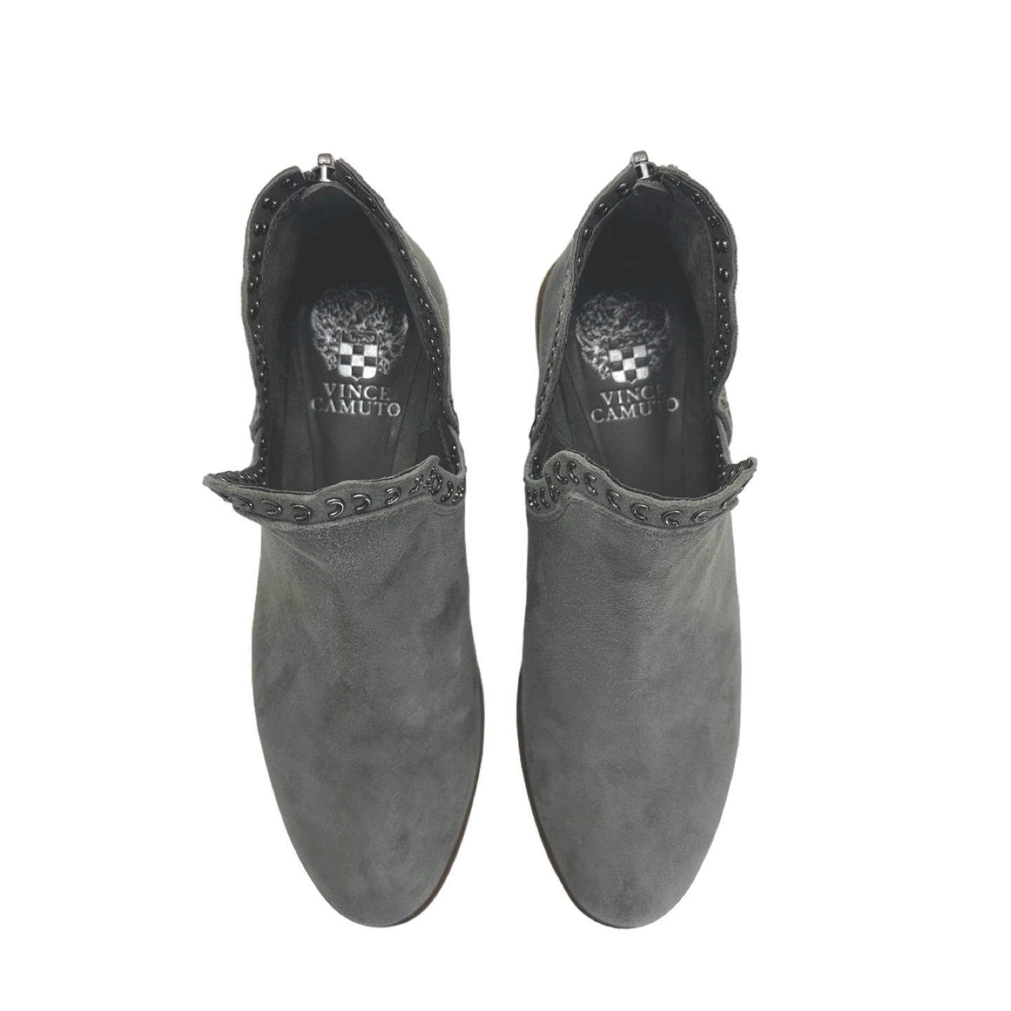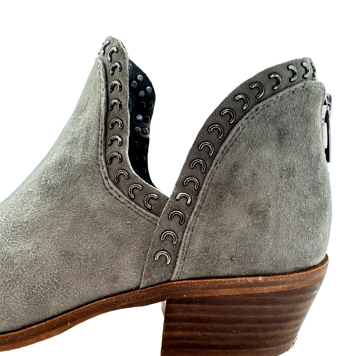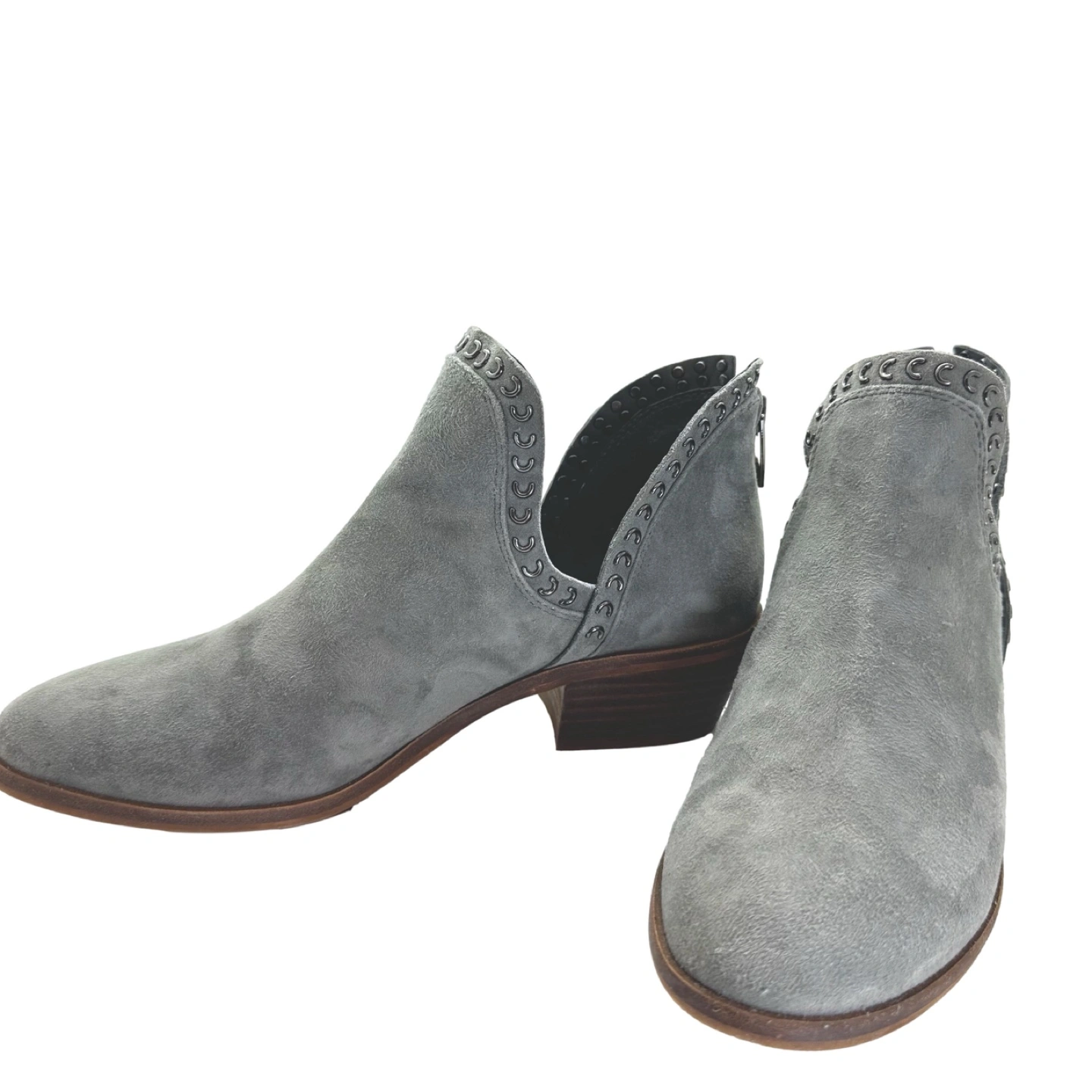 Selling a pair of Like New Vince Camuto booties back zip in a lovely gray suede! They retail for $150 . Size 7 M and they have a cute cut out with stylish eyelet design. Perfect for adding a touch of edginess to any outfit! Measurements available on request.