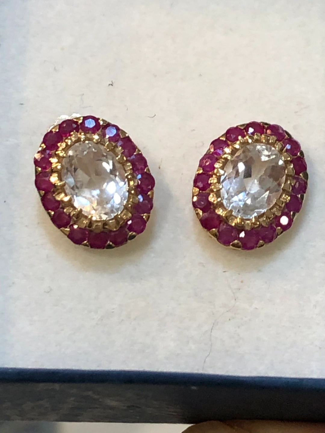 These are a pair of vintage 10k yellow gold earrings featuring a clear sapphire centre surrounded by small rubies . They're in great condition and would make a lovely addition to any jewellery collection!